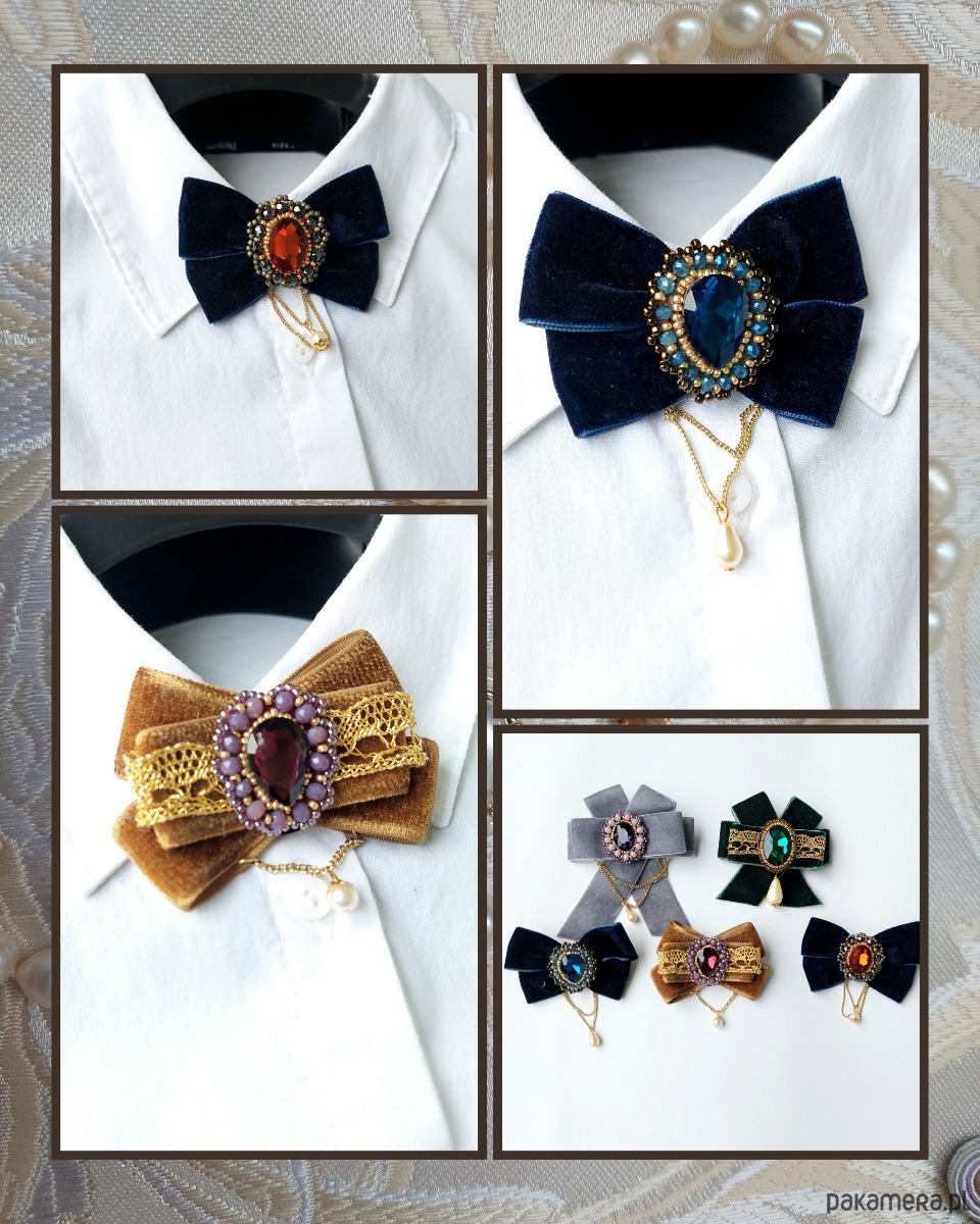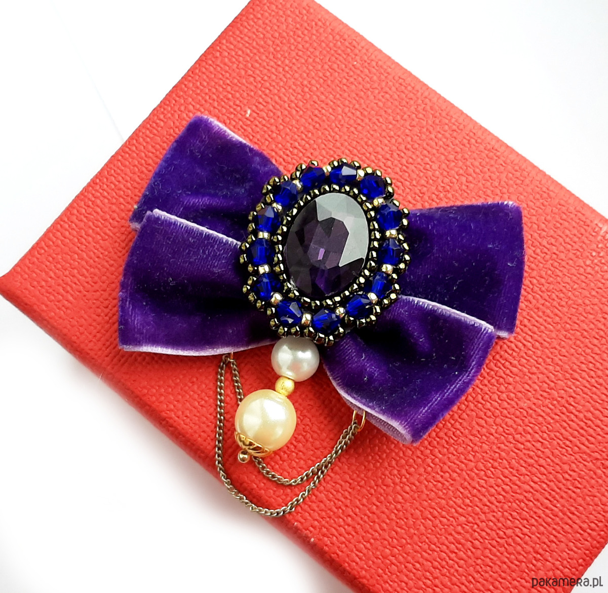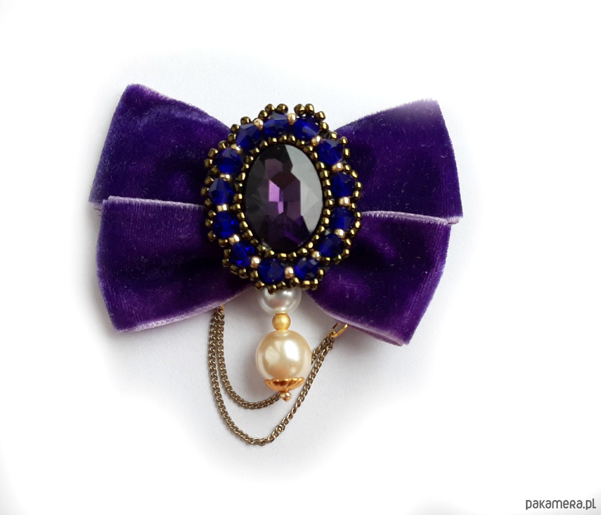 Stylowa aksamitna broszka wykonana w pojedynczym egzemplarzu z myślą o osobach, które szukają urozmaicenia przy codziennych stylizacjach. Lekkości i dziewczęcości dodają jej łańcuszki w kolorze złotym z perełkami.Wielkość broszki to ok 8x5,5 cm. Z pewnością będzie oryginalnym dodatkiem do niejednej kreacji.