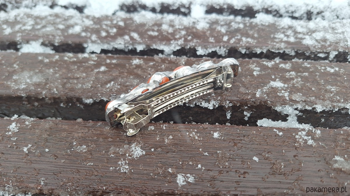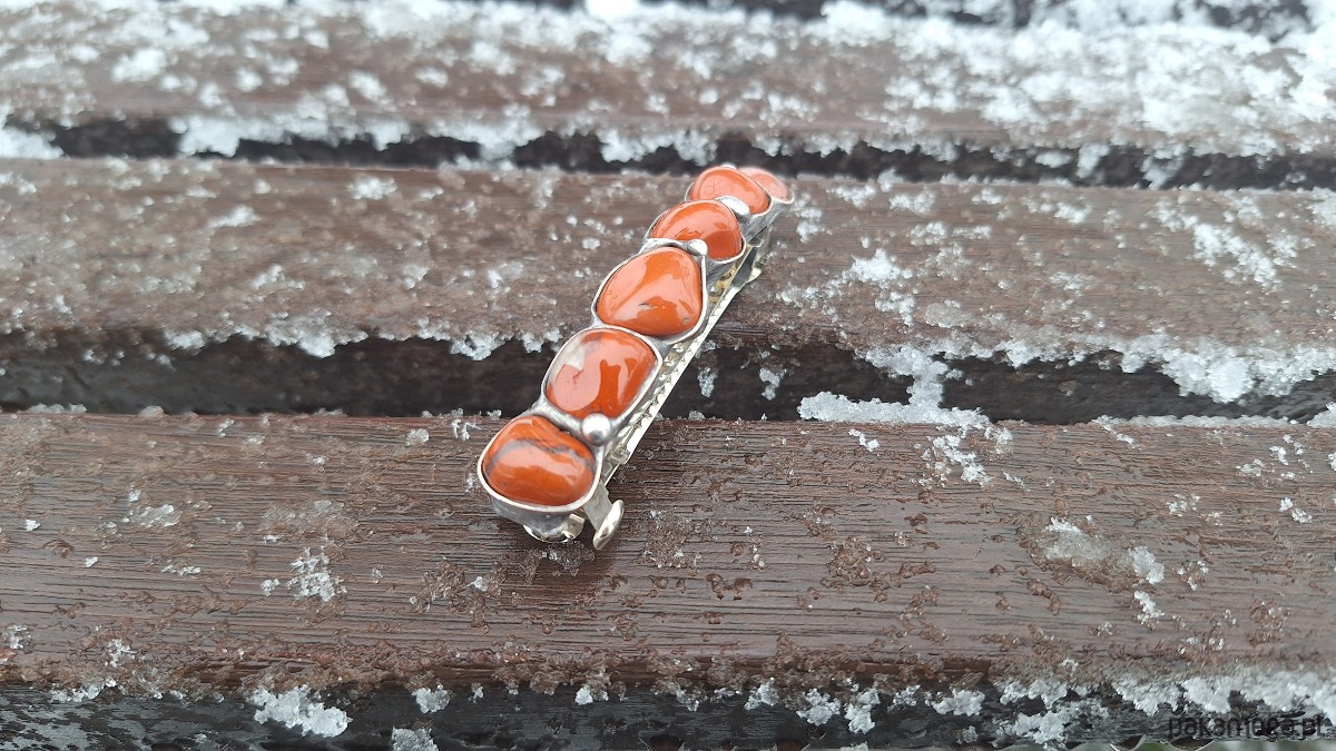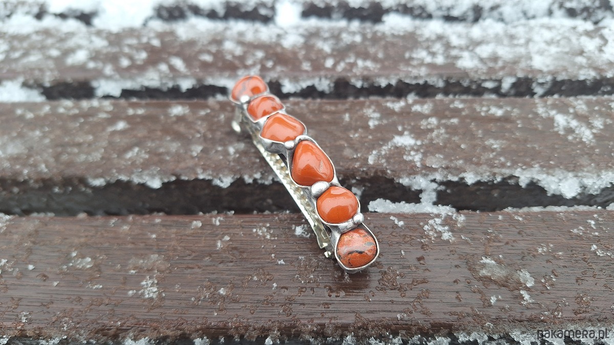 Klamra do włosów, wykonana z miedzi, cyny i jaspisów. Wymiary ok. 8 na 1.3 cm. Zapięcie 6 cm, metalowe.