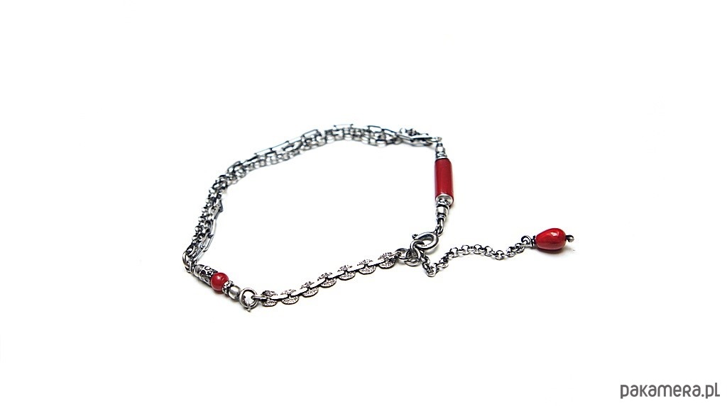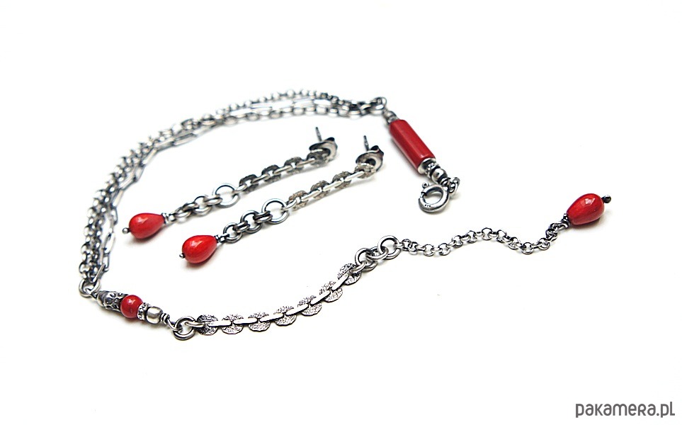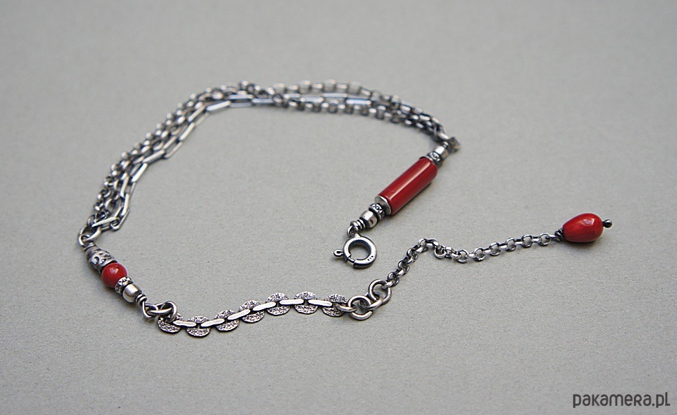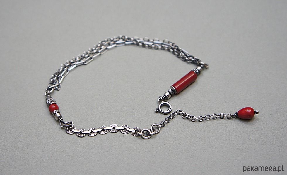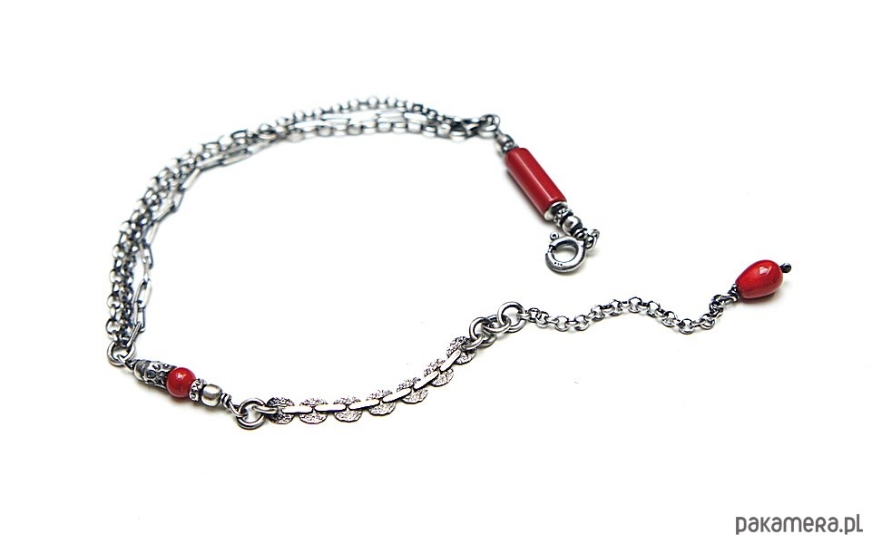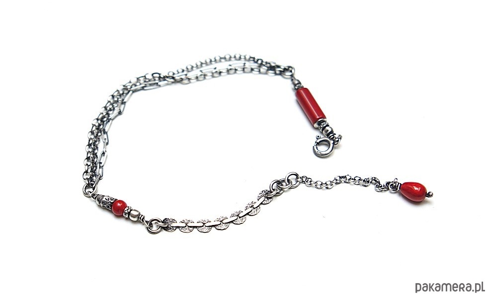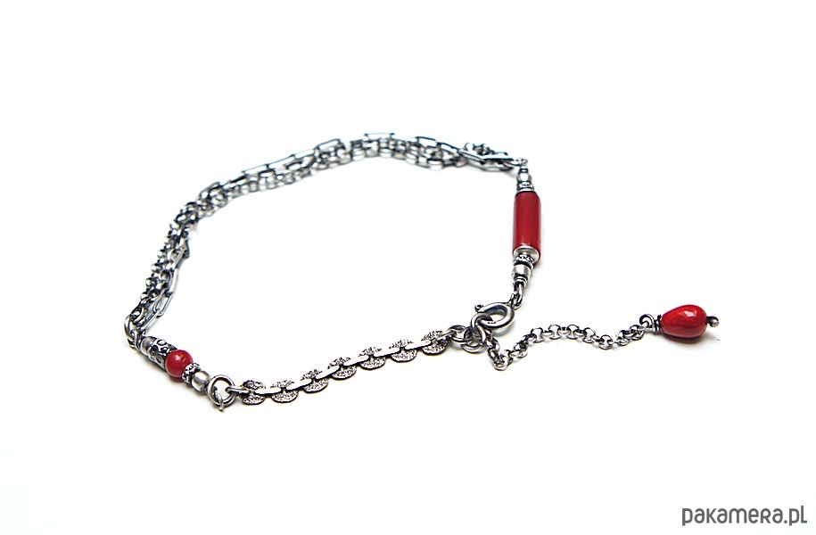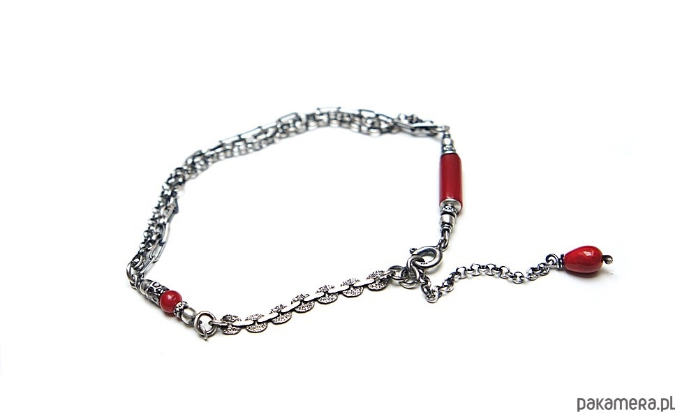 Bransoletka wykonana ze srebra [pr. 925] w połączeniu z koralem czerwonym [12mm, 8mm i 4mm ]. Srebro oksydowane i przetarte. Całkowita długość bransoletki 20cm plus ozdobna przedłużka. Biżuteria ozdobnie zapakowana. Do kompletu można dokupić kolczyki - dostępne w naszej galerii.