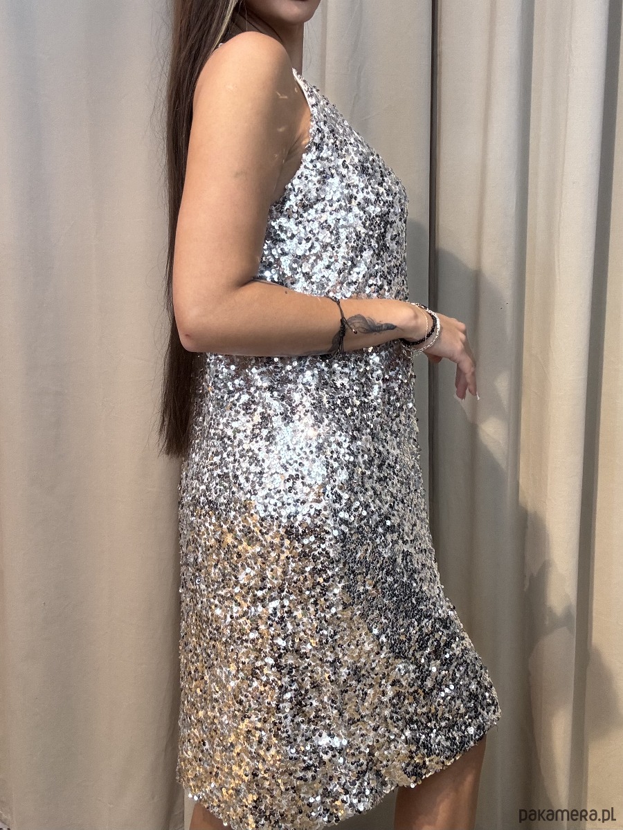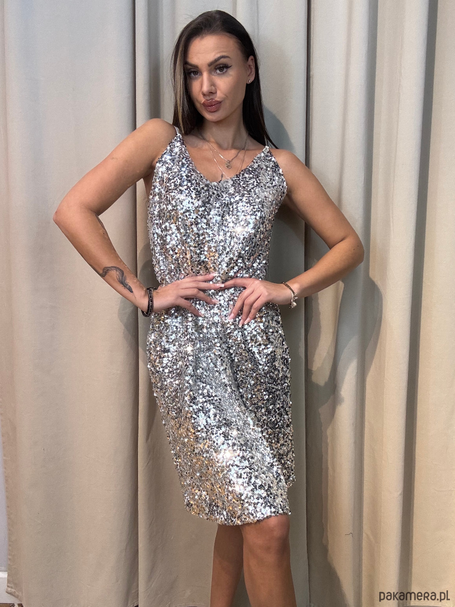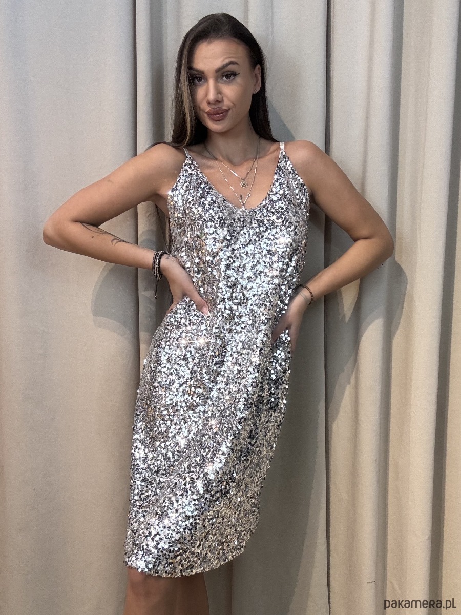 Sukienka cekinowa z regulowanymi ramiączkami.