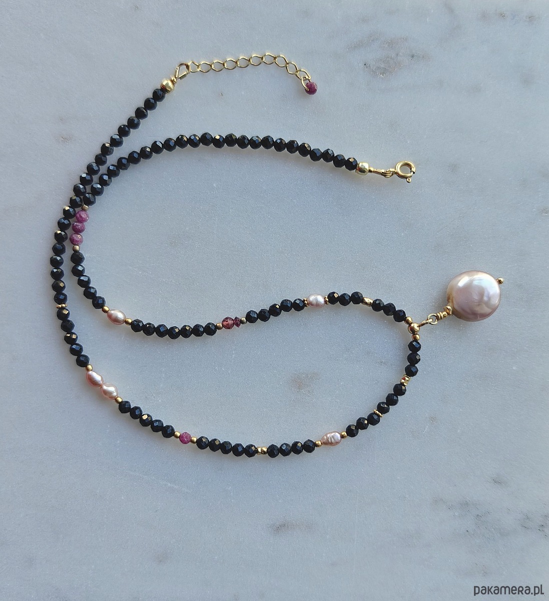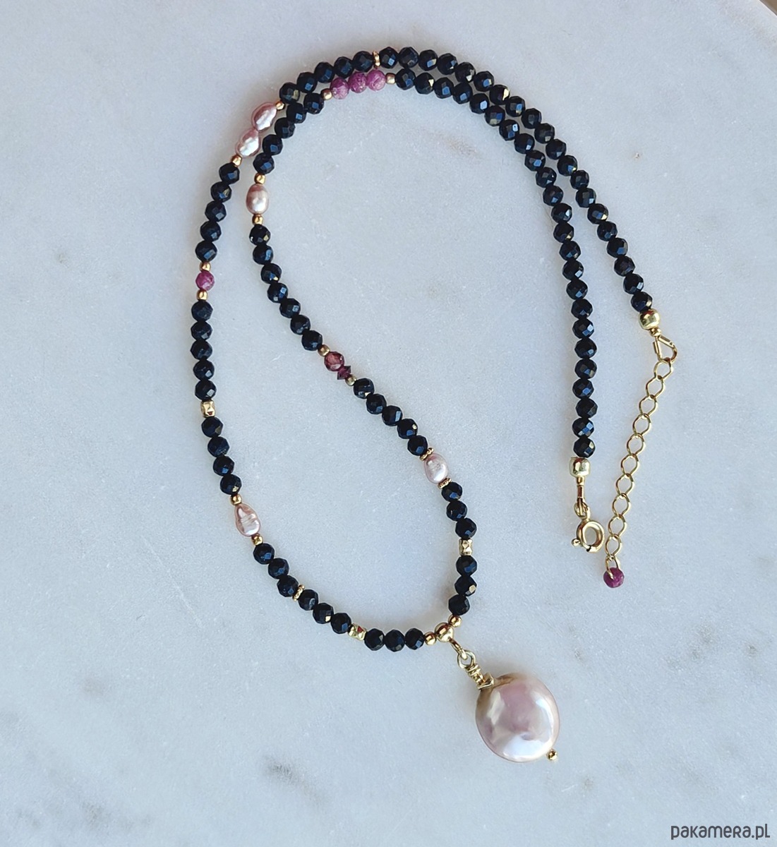 Choker z piękną, błyszczącą perłą w różowym kolorze ze złotymi odblaskami. Na sznurze turmaliny zostały przełożone rubinami, granatami i drobnymi różowymi perełkami. Wykończenie ze srebra 925 pozłacanego 24karatowym złotem.