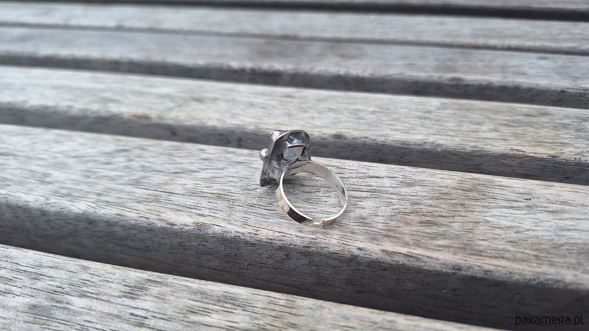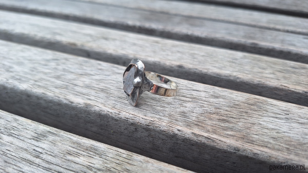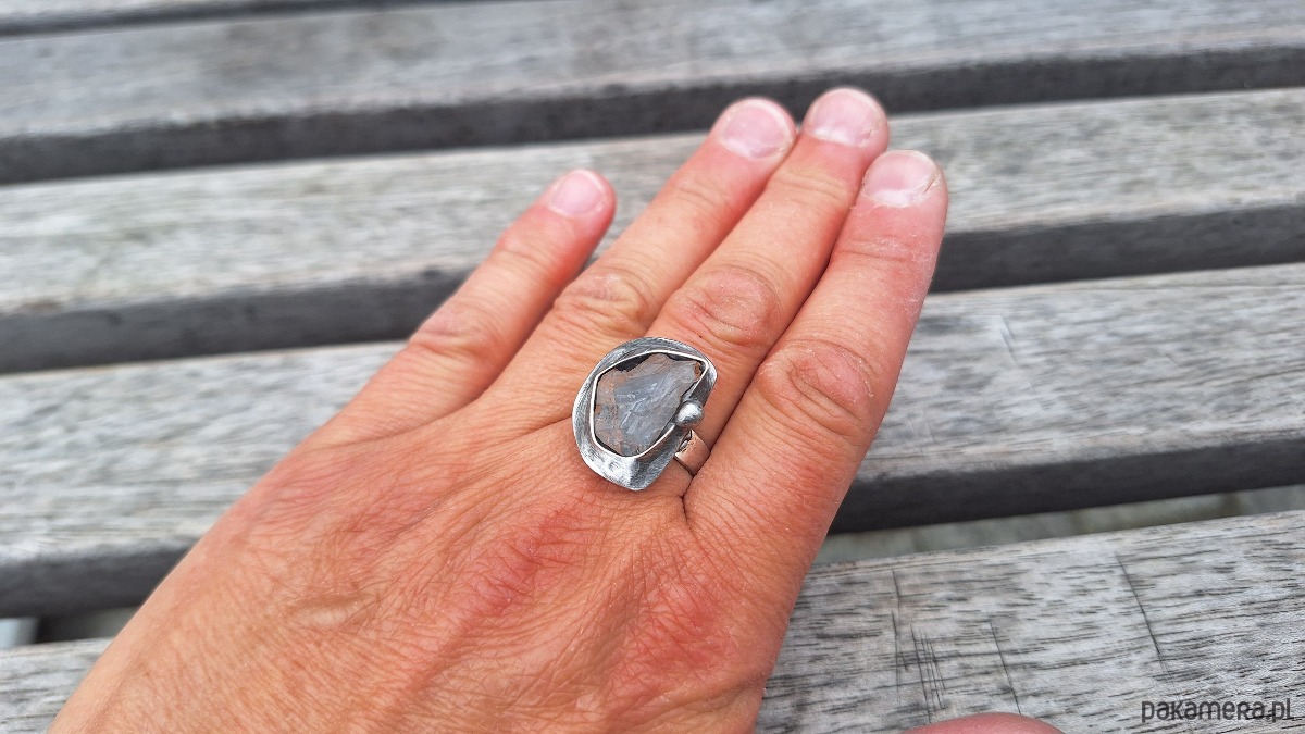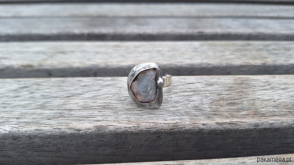 Pierścionek wykonany z miedzi, cyny i surowego celestynu. Wymiary ok. 2 na 1.5 cm. Regulowany. Nie jest ciężki.