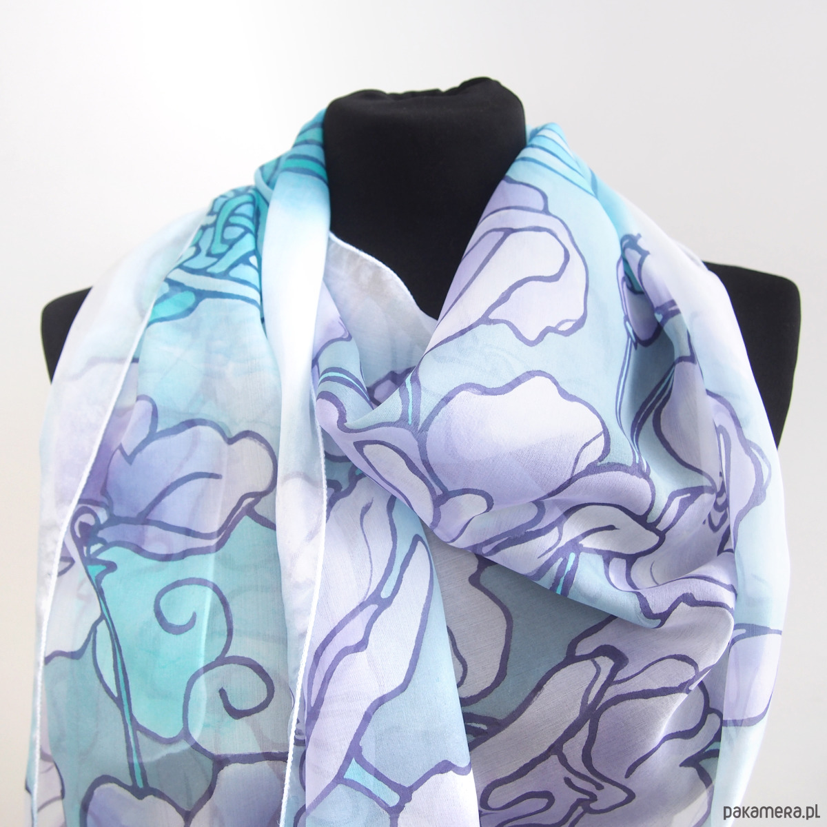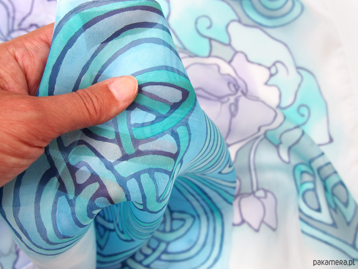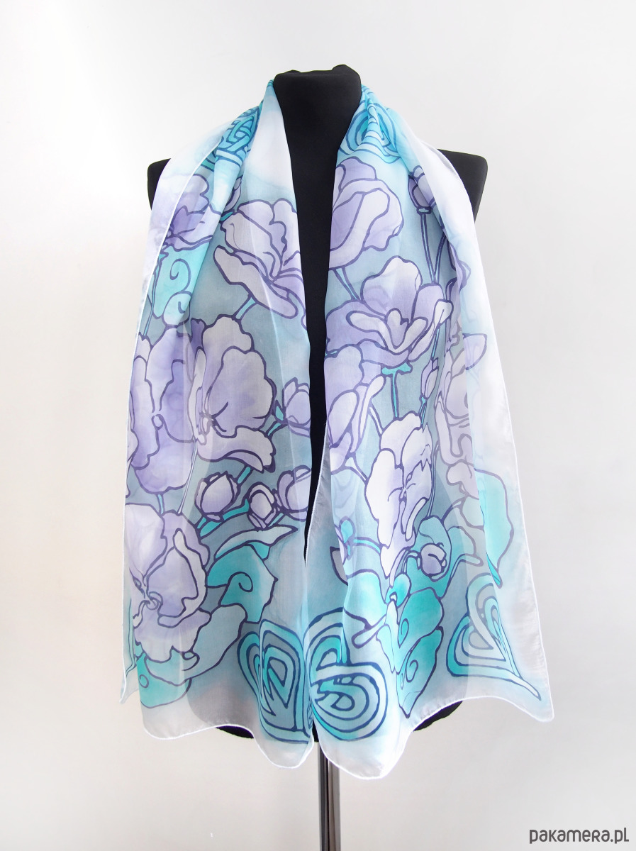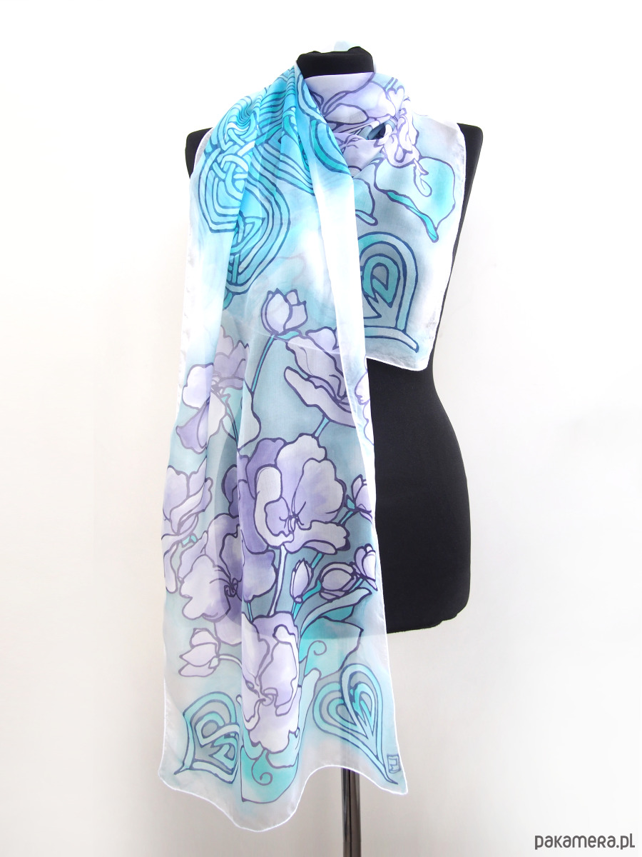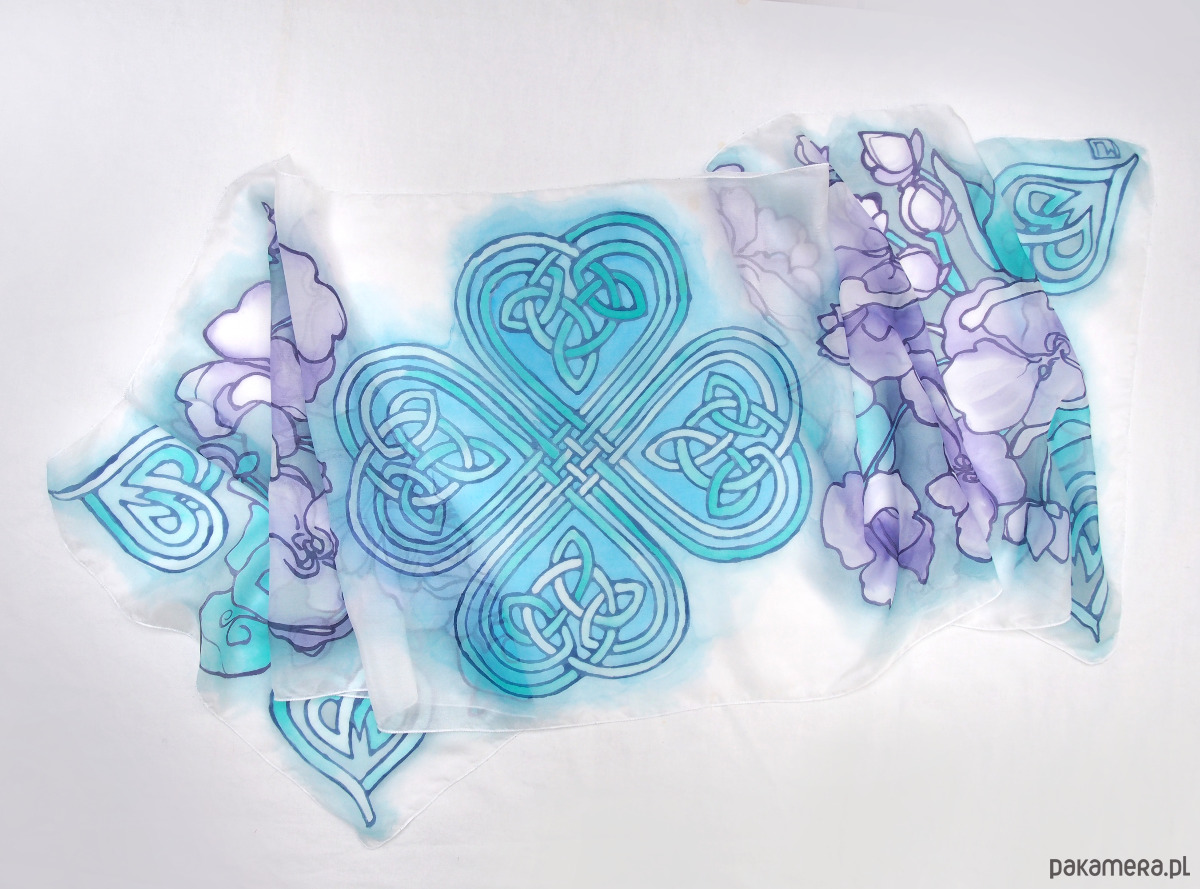 Piękny jedwabny szalik, ręcznie zdobiony o wzorach inspirowanych Celtyckimi węzłami oraz delikatnymi kwiatami fiołków.