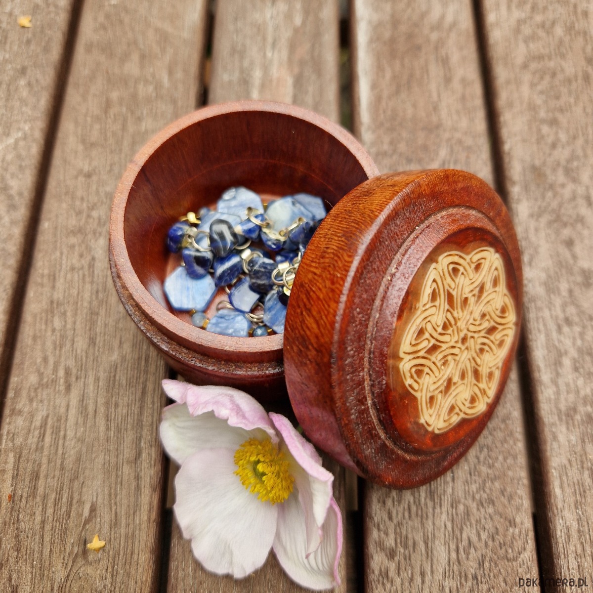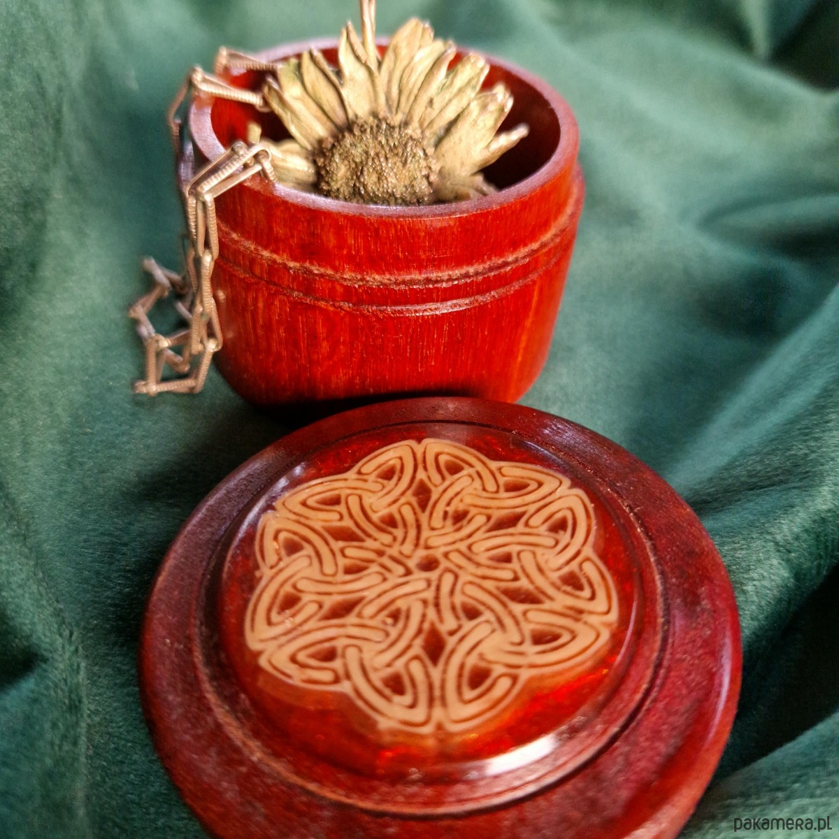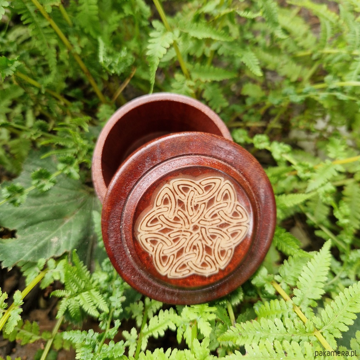 Rozetka zdobiąca pokrywkę to delikatny krąg węzłów triquetra, podkreśla celtycką tradycję i dodaje symbolicznej głębi. Subtelne, ale wywierające wrażenie, celtyckie drewniane pudełeczko na pierścionek łączy kunszt, piękno i znaczenie, spogląda z toaletki i trudno o nim zapomnieć.