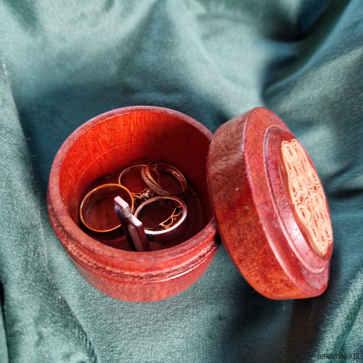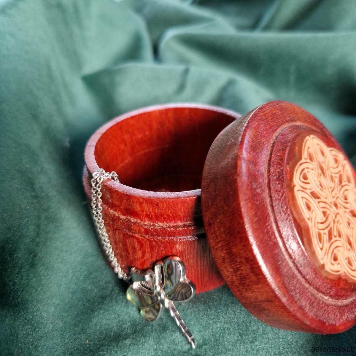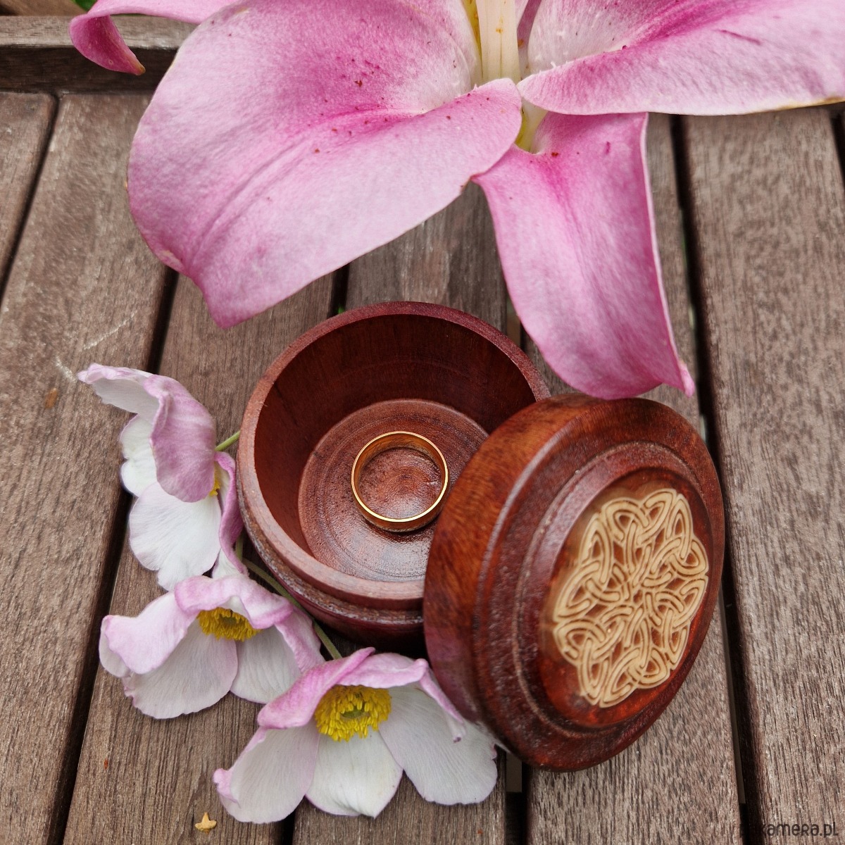 Rozetka zdobiąca pokrywkę to delikatny krąg węzłów triquetra, podkreśla celtycką tradycję i dodaje symbolicznej głębi. Subtelne, ale wywierające wrażenie, celtyckie drewniane pudełeczko na pierścionek łączy kunszt, piękno i znaczenie, spogląda z toaletki i trudno o nim zapomnieć.