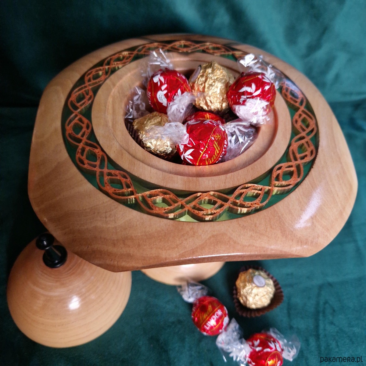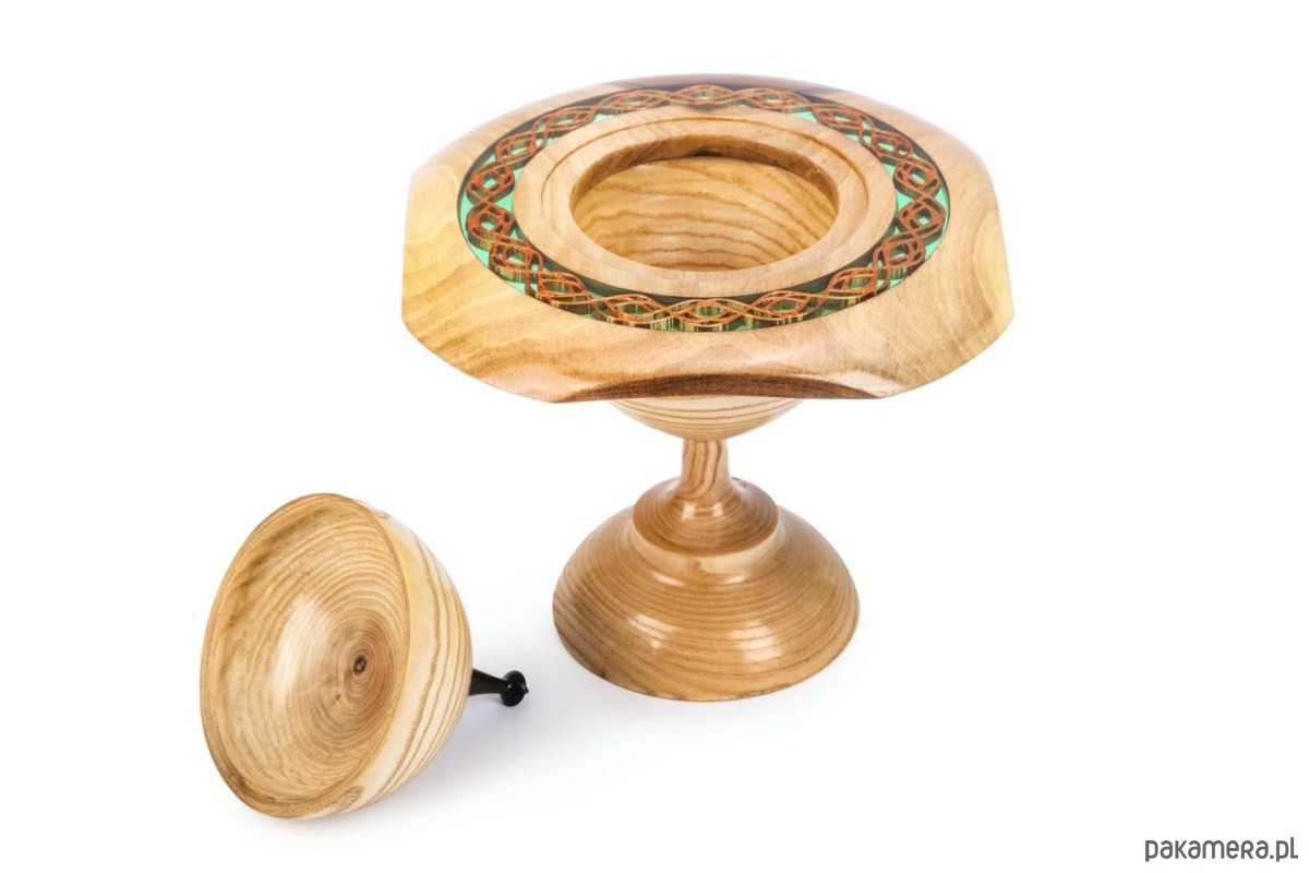 Ręcznie wykonana drewniana bombonierka czerpie z bogatych mitów i znaczeń. Zainspirowana czekoladowym prezentem od wielkanocnego zajączka, celebruje życie, odrodzenie i radość. Święte tradycje i bliskowschodnie wzory naczyń kształtują jej elegancką formę. Ręcznie wykonane z drewna jesionowego, jabłoniowego i hebanowego pudełko ma przezroczystą krawędź epoksydową i miedzianą wkładkę, która rzuca delikatny, ciepły blask na powierzchnię poniżej.