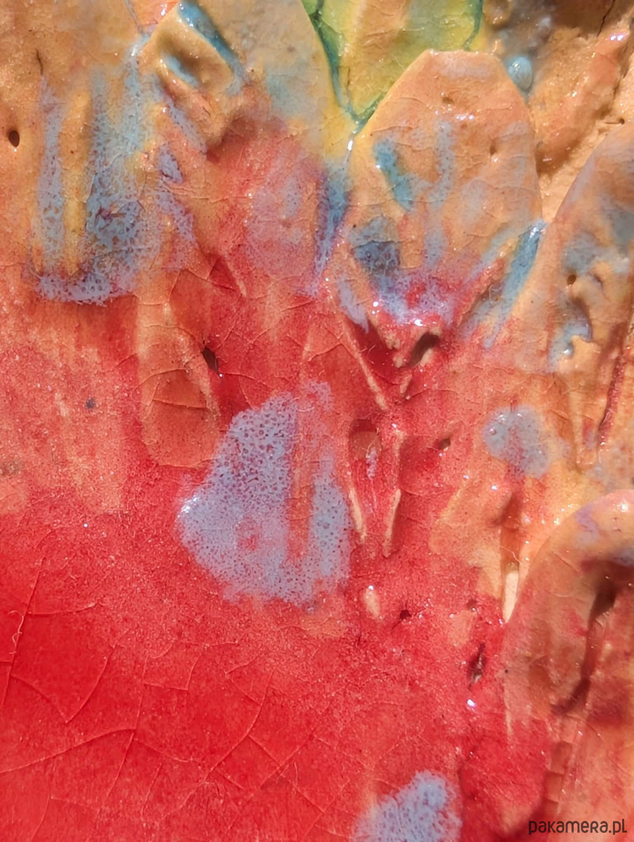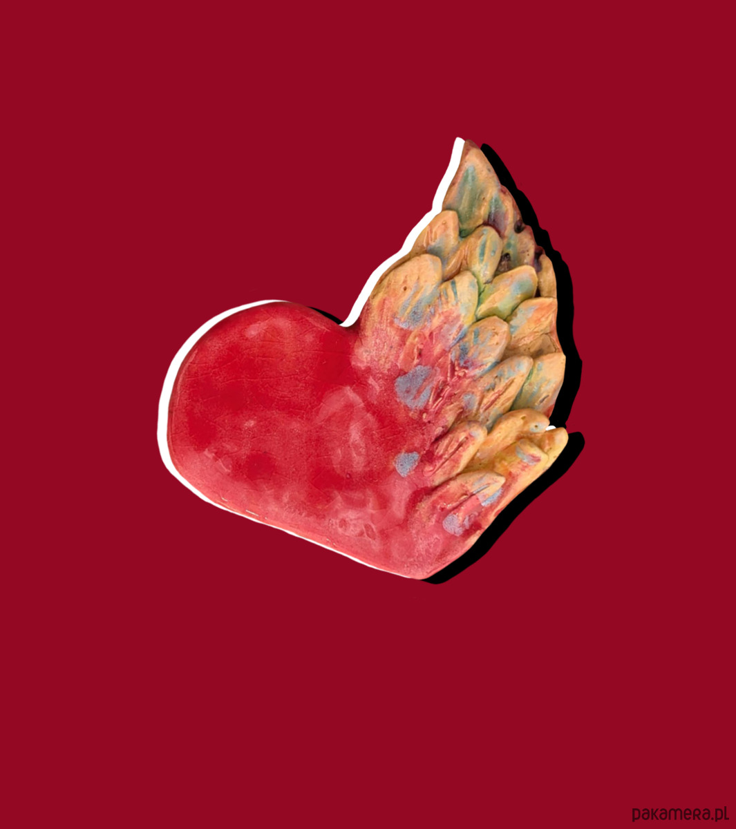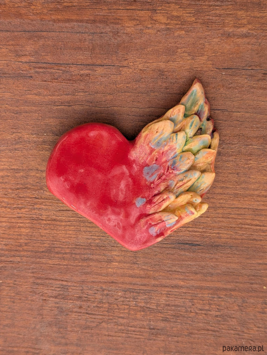 Czerwone serce i skrzydło w naturalnych odcieniach gliny z nutą zieleni i błękitu – połączenie ognia i powietrza, miłości i wolności. Ta ceramiczna broszka została ręcznie uformowana i szkliwiona, dzięki czemu każdy egzemplarz jest niepowtarzalnym małym dziełem sztuki.
