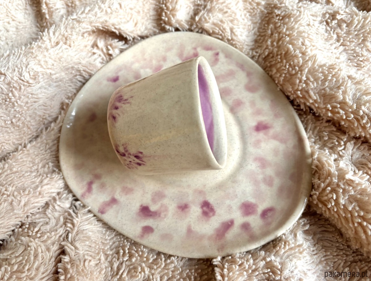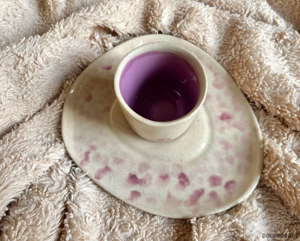 Zestaw zawiera ceramiczną czarkę i talerzyk "Fiołki". Jest lekki i subtelny niczym pierwsze wiosenne fiołki. Czarka idealnie nadaje się pod poranne espresso lub popijanie herbaty w ciągu dnia delektując się widokiem subtelnego fioletowego motywu. Brzegi talerzyka lekko falują niczym płatki fiołków i są pojemne na tyle, aby pomieścić oprócz czarki drobną przekąskę.