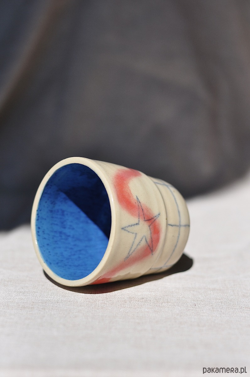 Ceramiczna czarka ręcznie wytoczona na kole, pokryta szkliwem bezpiecznym do kontaktu z żywnością.
