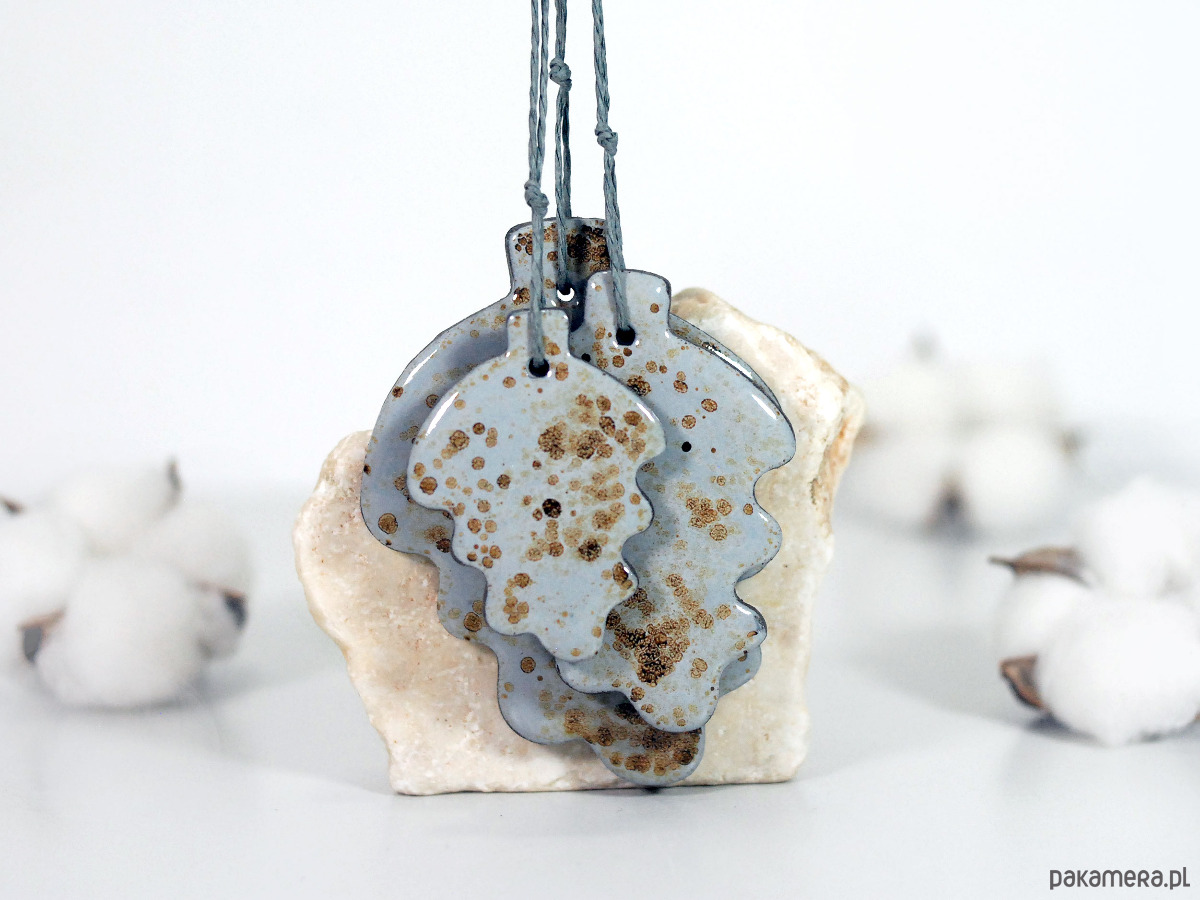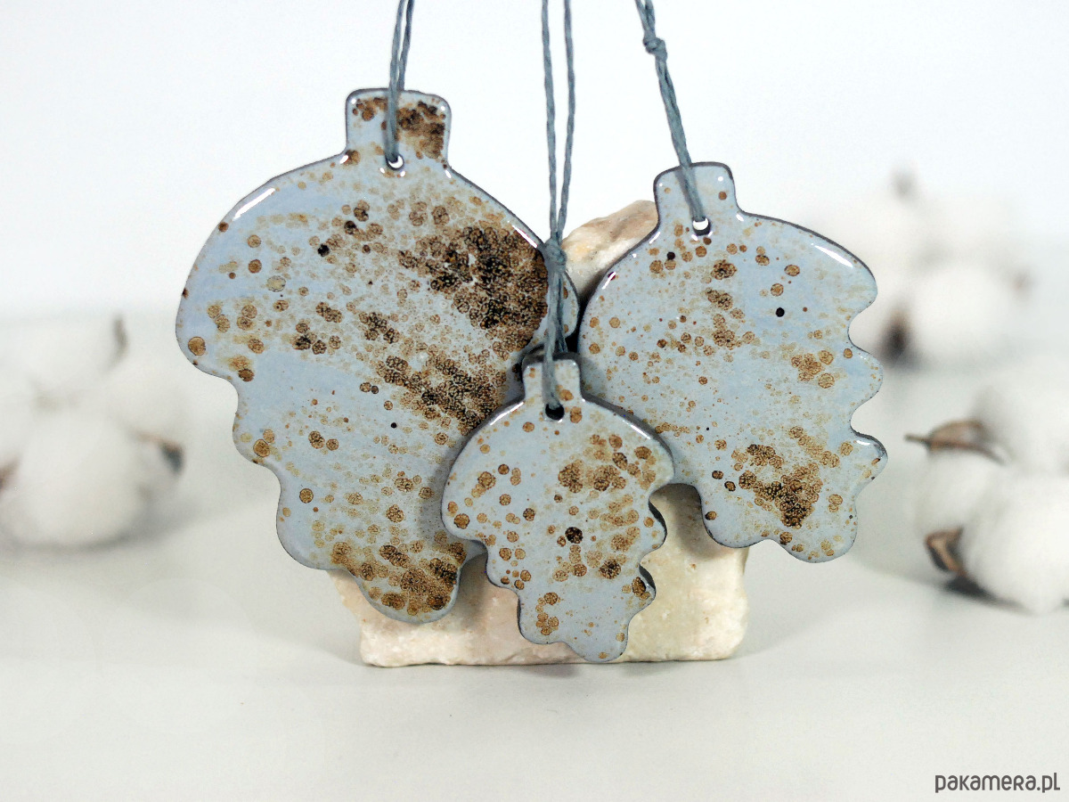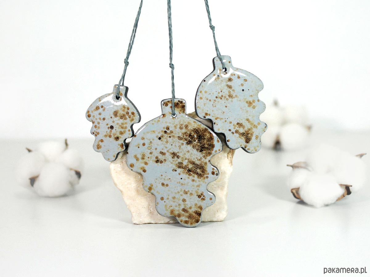 Zestaw trzech ceramicznych liści w odcieniu subtelnej szarości, ozdobionych unikatowym, brązowym nakrapianiem. Lekka, wiosenna dekoracja, która doskonale zaprezentuje się na świeżych gałązkach w wazonie, w oknie lub jako element wiosennego wystroju domu.