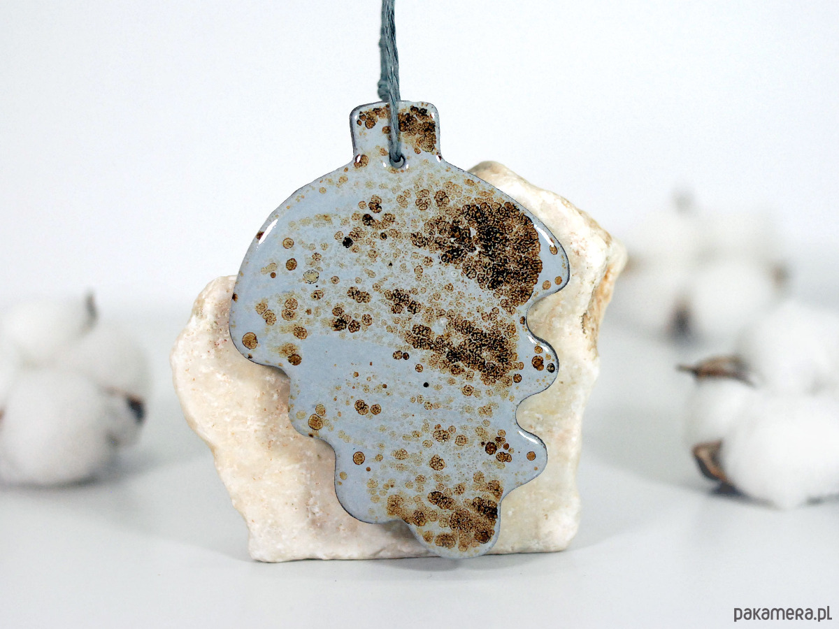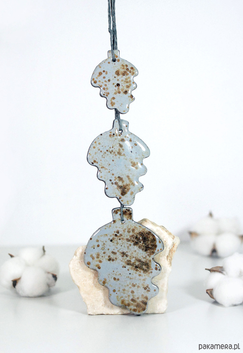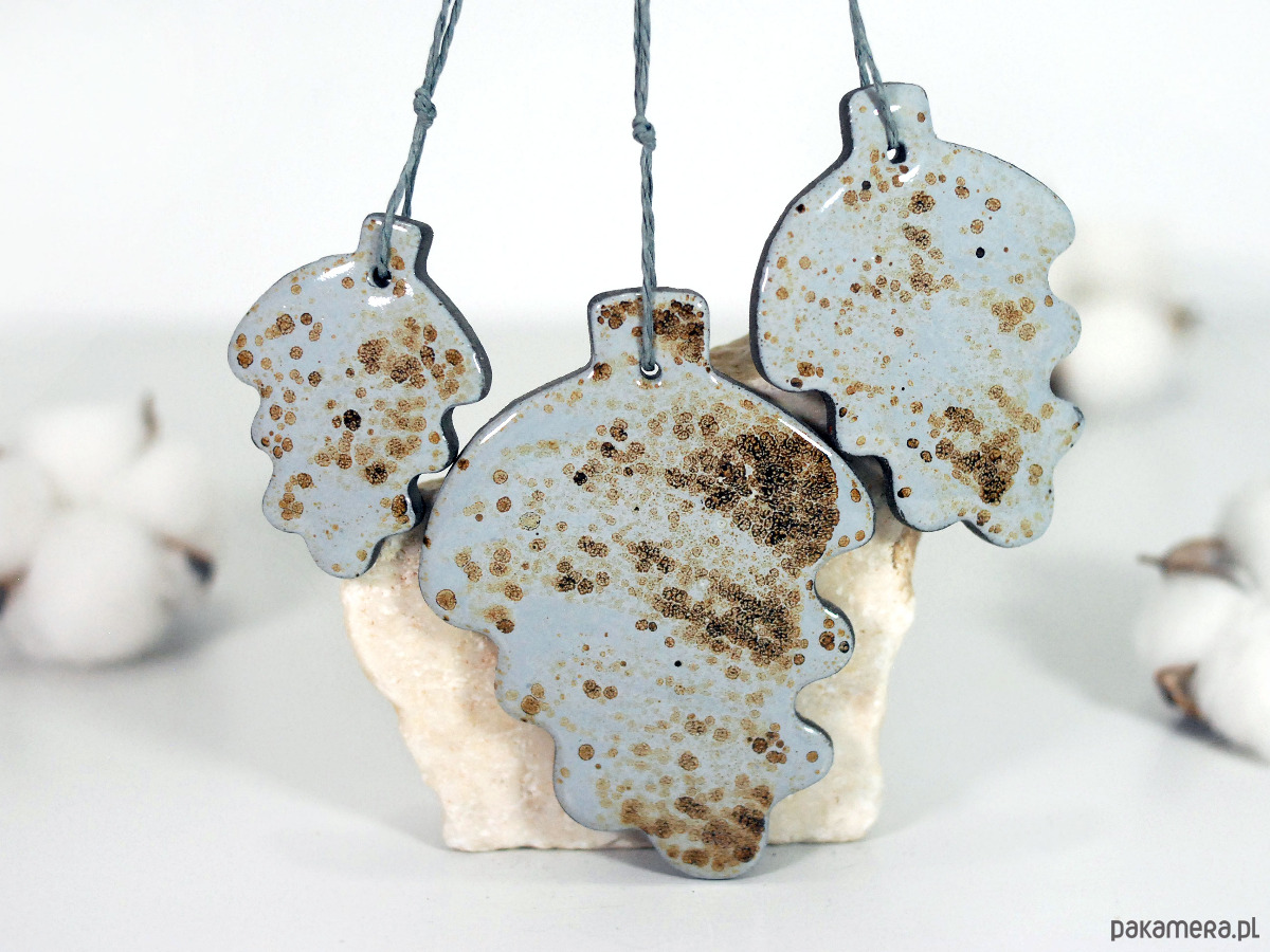 Zestaw trzech ceramicznych liści w odcieniu subtelnej szarości, ozdobionych unikatowym, brązowym nakrapianiem. Lekka, wiosenna dekoracja, która doskonale zaprezentuje się na świeżych gałązkach w wazonie, w oknie lub jako element wiosennego wystroju domu.