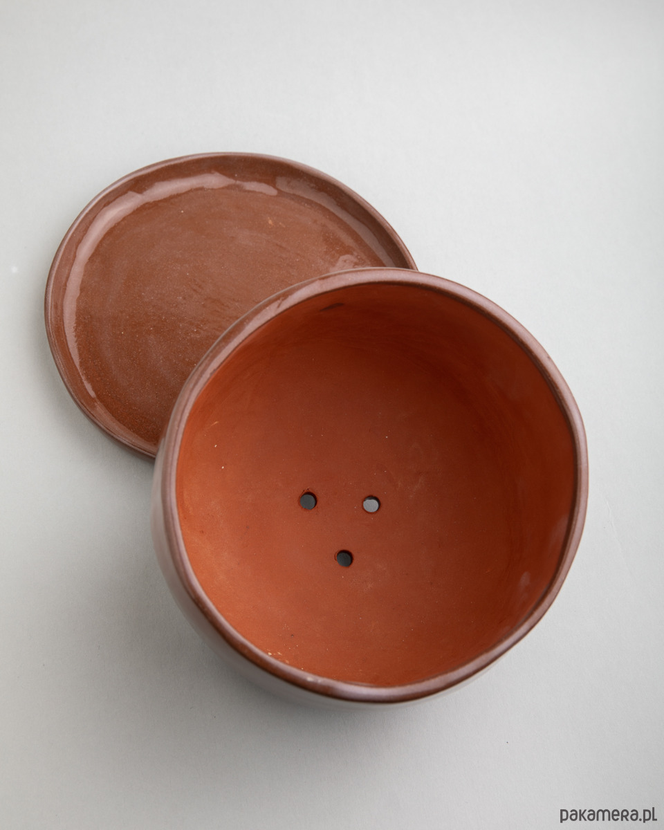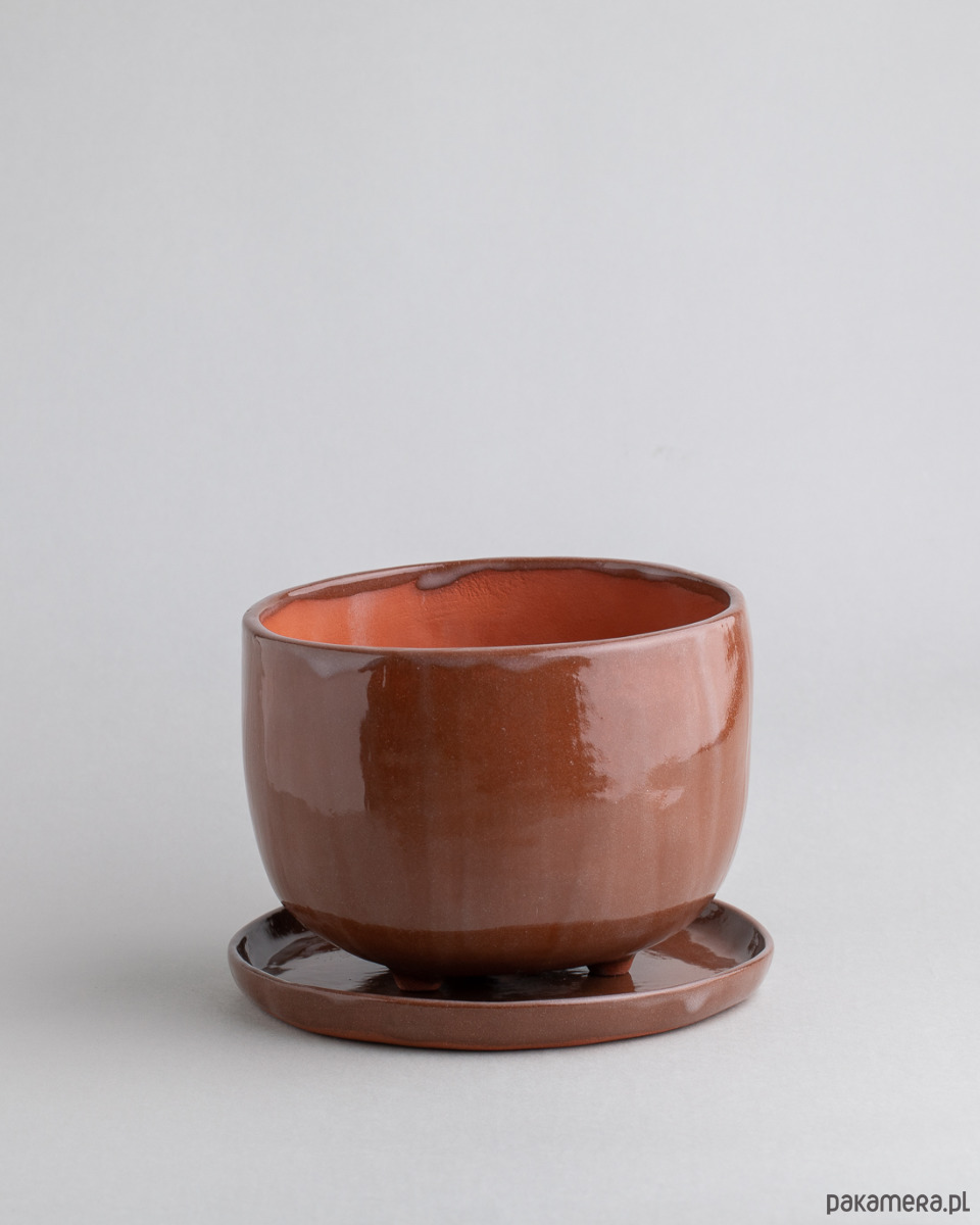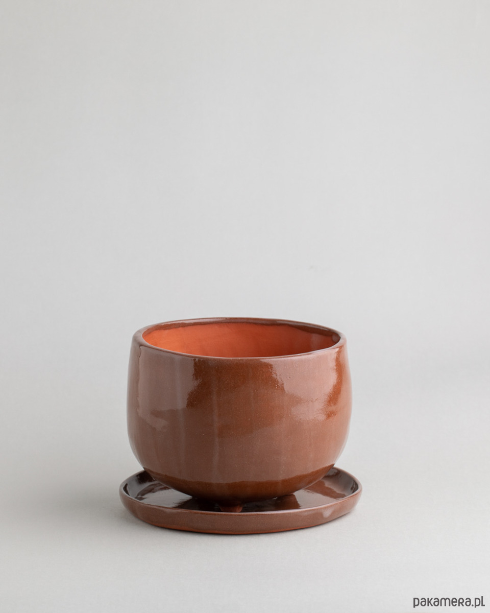 Podstawka oraz zewnętrzna strona doniczki pokryta jest transparentnym szkliwem, co nadaje glinie bardziej brązowy odcień.
