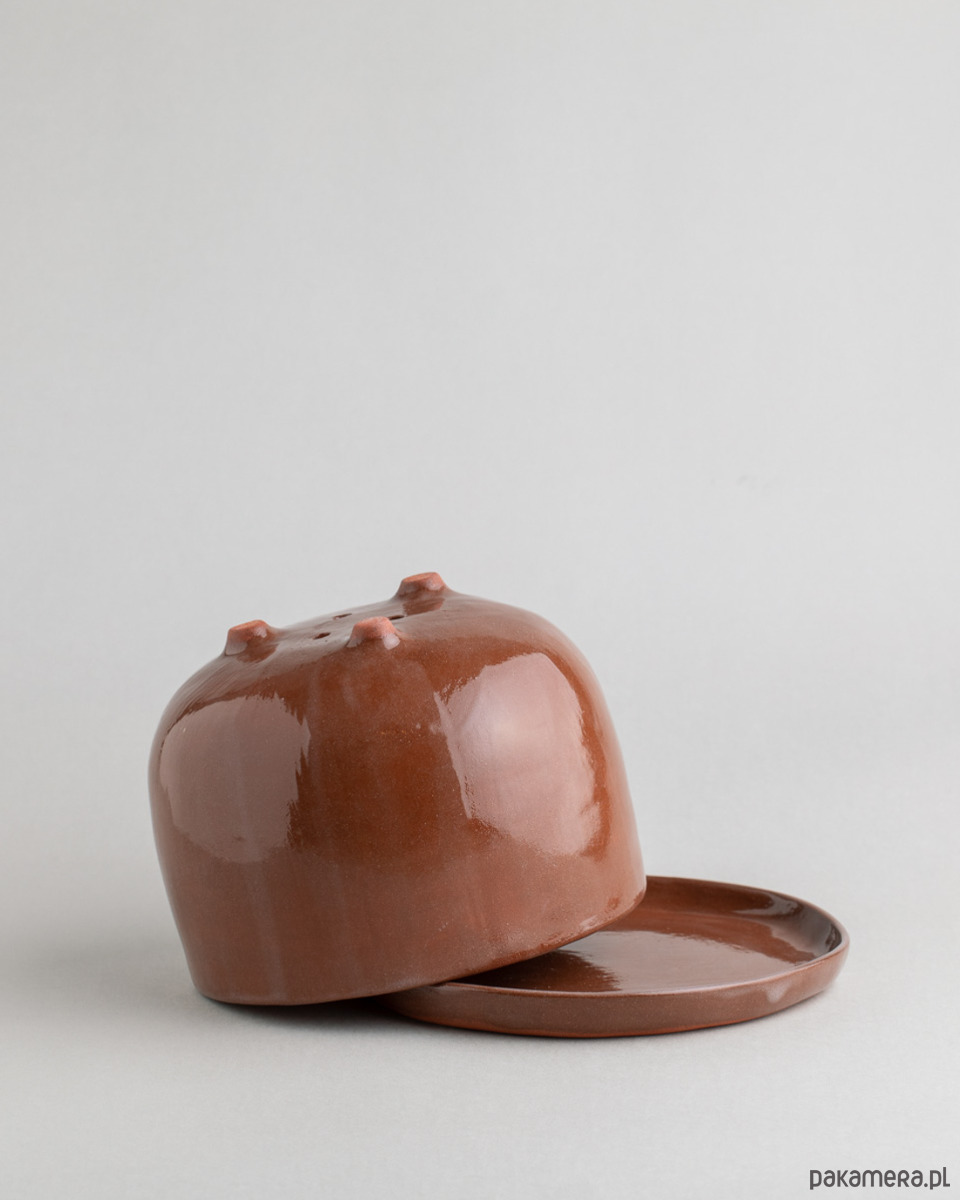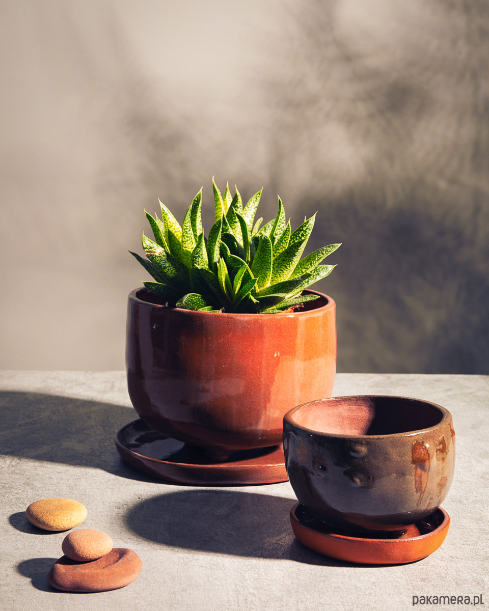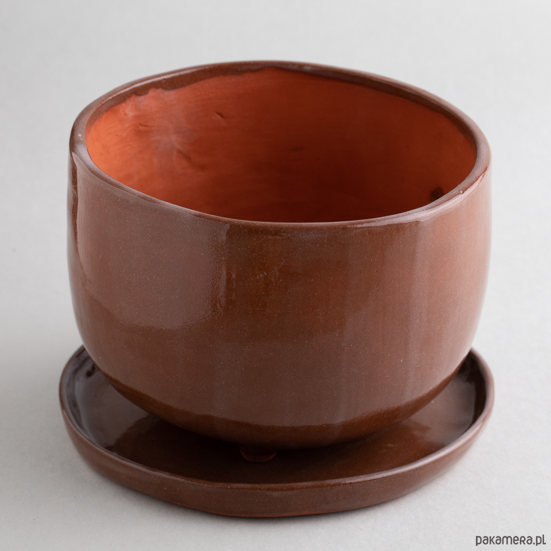Podstawka oraz zewnętrzna strona doniczki pokryta jest transparentnym szkliwem, co nadaje glinie bardziej brązowy odcień.