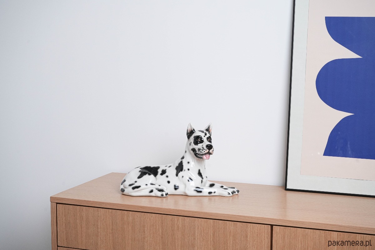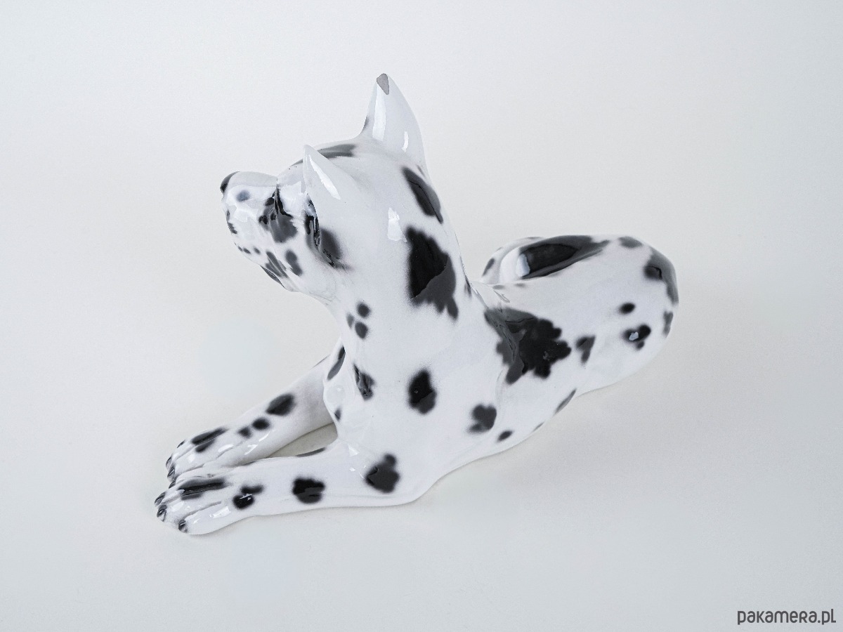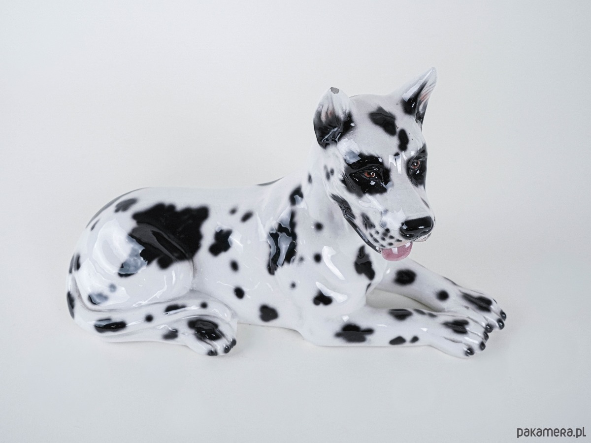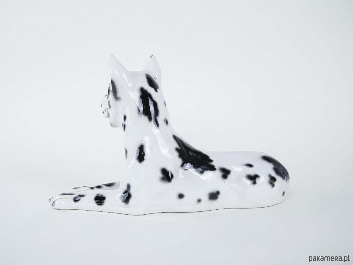 Duża figurka dekoracyjna przedstawiająca Doga Arlekina, wykonana z ceramiki szkliwionej, lata 60./70. XX wieku. Rzeźba realistycznie oddaje cechy rasy – charakterystyczne czarno-białe umaszczenie, proporcje i dostojną sylwetkę psa. Tego typu figurki powstawały we włoskich i hiszpańskich manufakturach ceramiki dekoracyjnej, często sprzedawane były jako efektowne dekoracje wnętrz w stylu glamour i hollywood regency. Doskonały przykład rzeźby użytkowej łączącej funkcję dekoracyjną z odrobiną figlarności – wierny towarzysz w porcelanowej odsłonie.