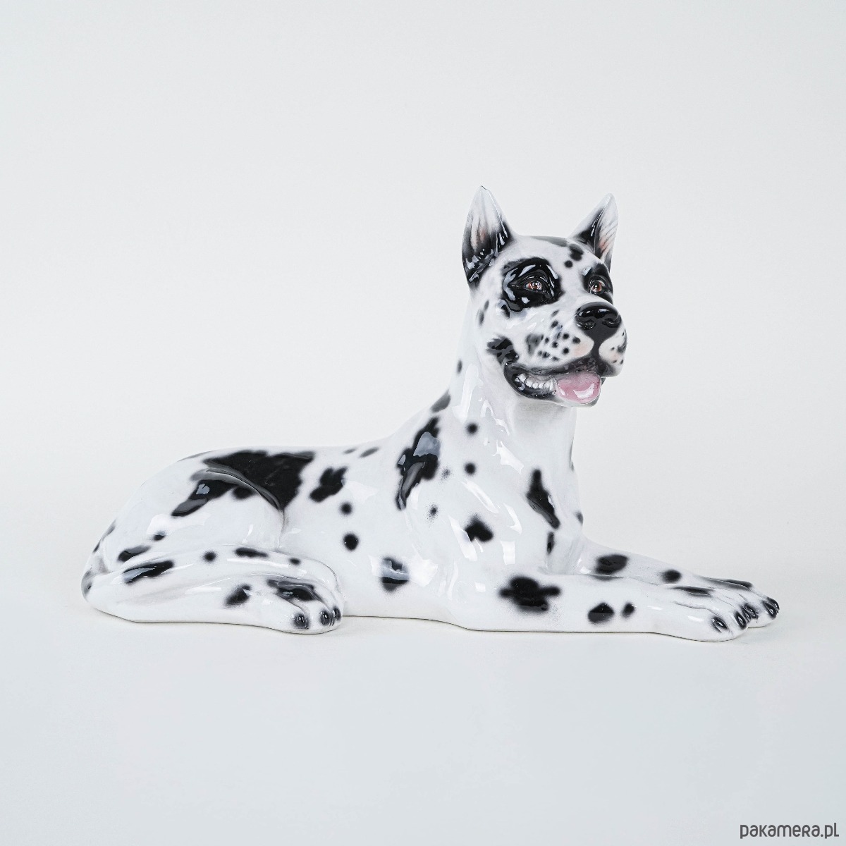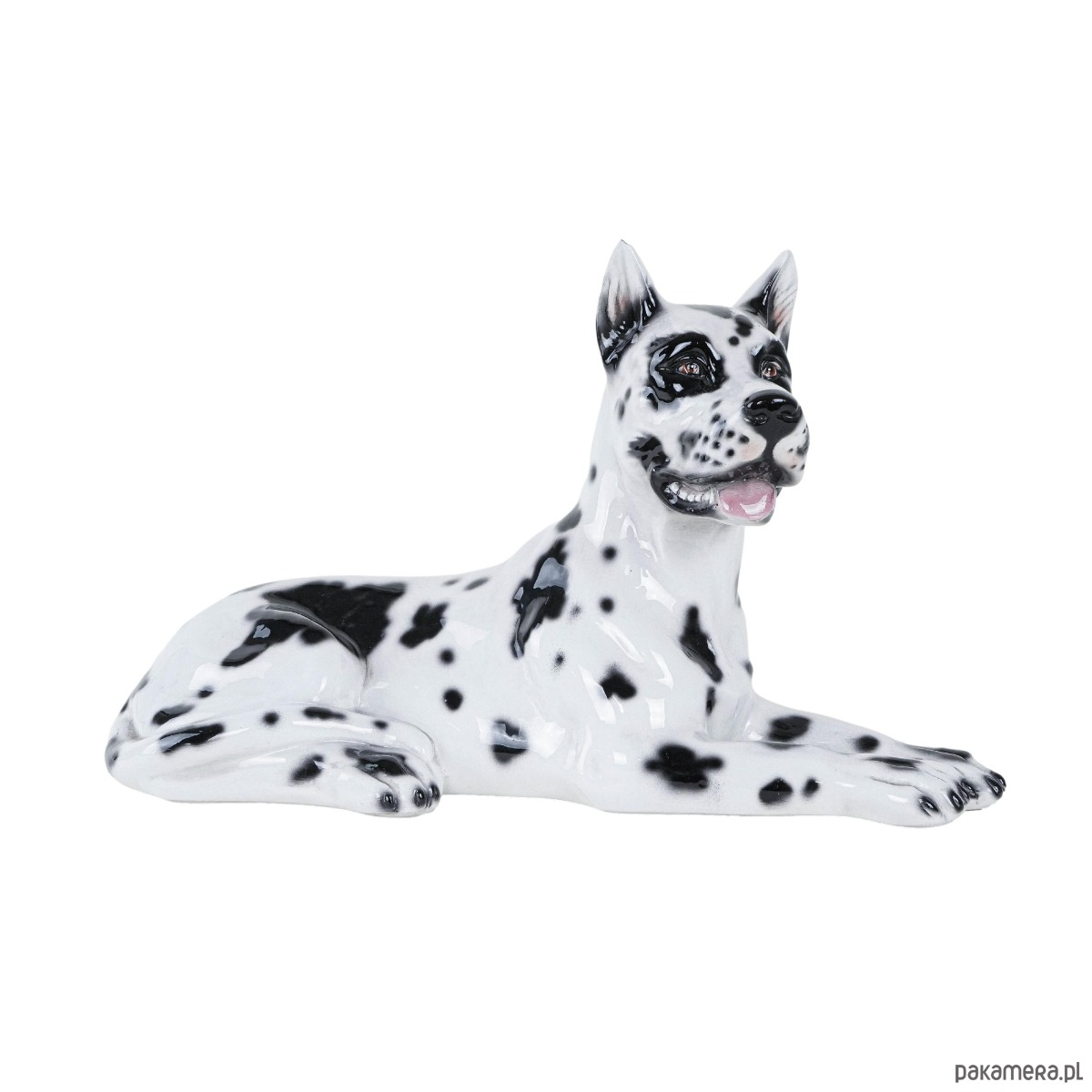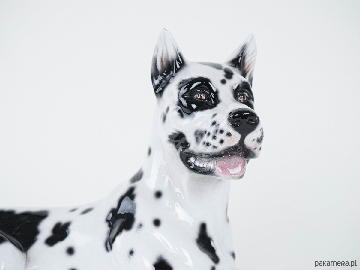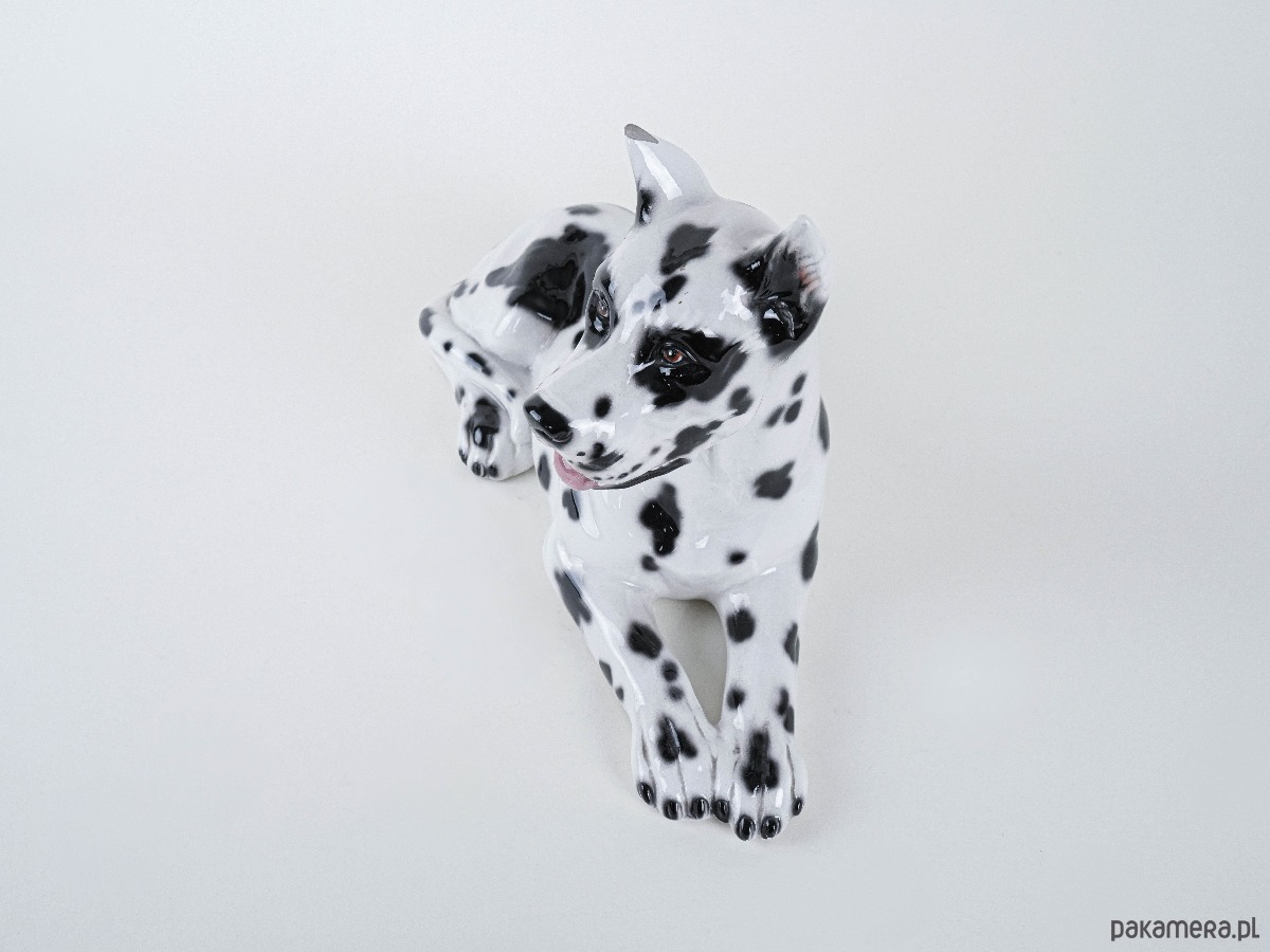 Duża figurka dekoracyjna przedstawiająca Doga Arlekina, wykonana z ceramiki szkliwionej, lata 60./70. XX wieku. Rzeźba realistycznie oddaje cechy rasy – charakterystyczne czarno-białe umaszczenie, proporcje i dostojną sylwetkę psa. Tego typu figurki powstawały we włoskich i hiszpańskich manufakturach ceramiki dekoracyjnej, często sprzedawane były jako efektowne dekoracje wnętrz w stylu glamour i hollywood regency. Doskonały przykład rzeźby użytkowej łączącej funkcję dekoracyjną z odrobiną figlarności – wierny towarzysz w porcelanowej odsłonie.