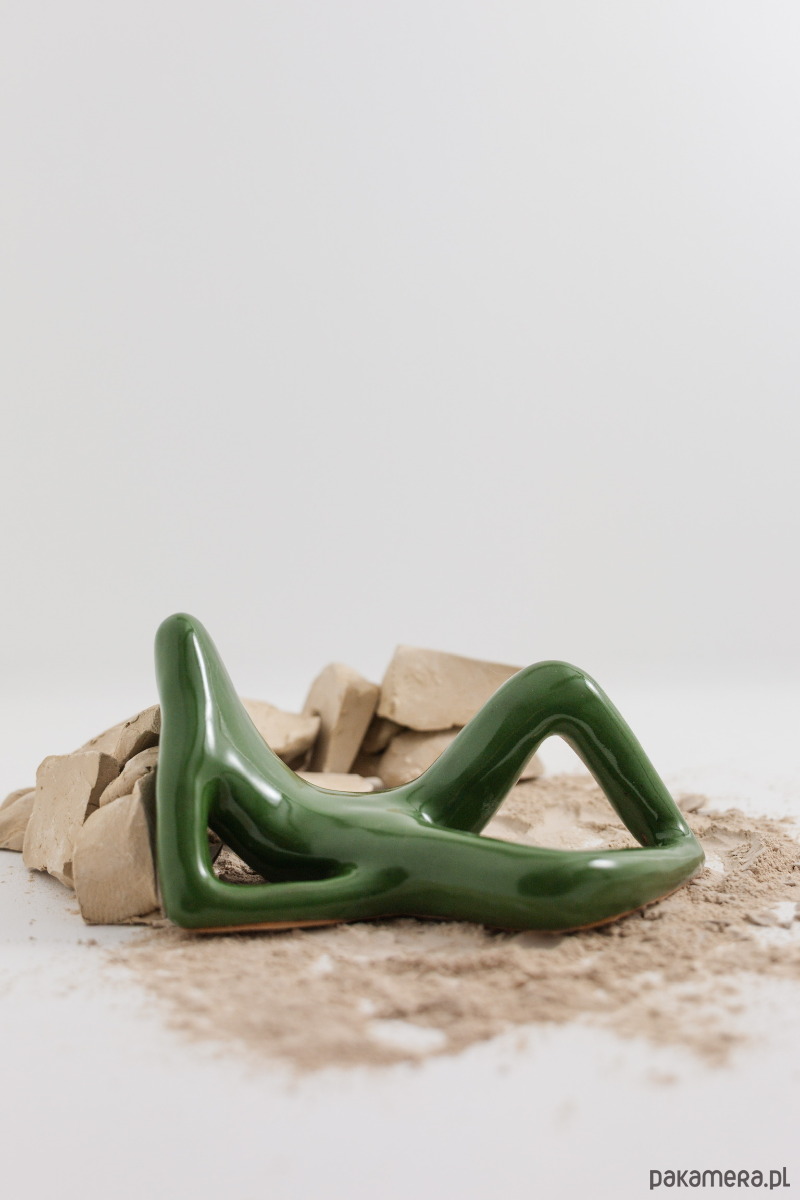 Figurka leżącej postaci w swobodnej, zrelaksowanej pozycji, z jedną nogą lekko ugiętą. Zielone szkliwo nadaje jej świeżości, przywołując skojarzenia z trawą, oddechem i byciem blisko natury.