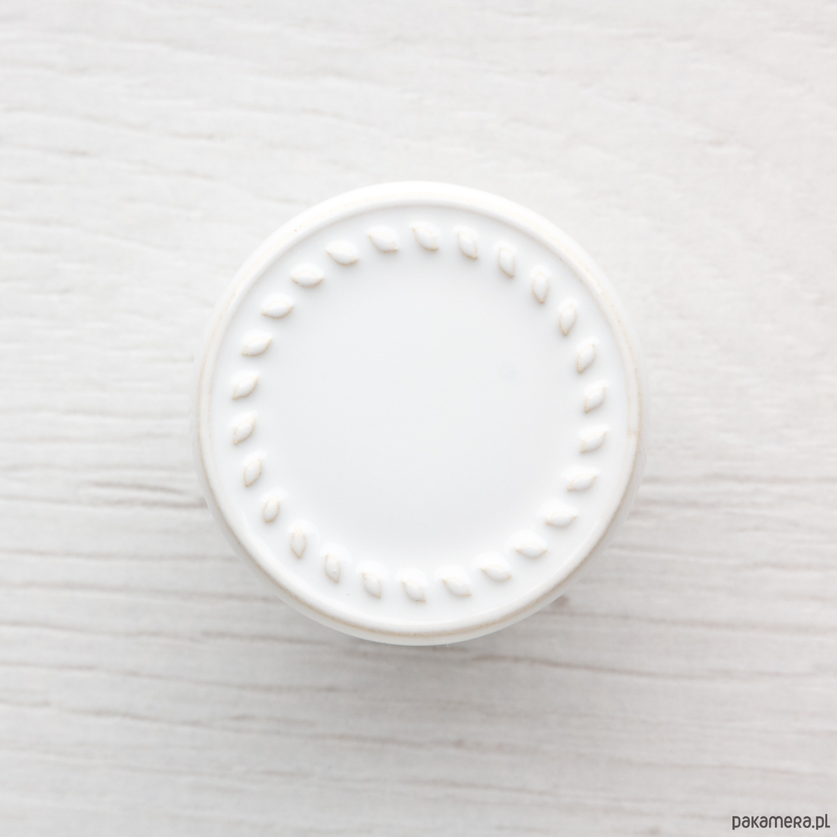 Ceramiczna gałka do mebli z lekko wypukłym ornamentem. Ręcznie wykonana z jasnej gliny, pokryta błyszczącym, szkliwem, wypalona dwukrotnie w wysokiej temperaturze.