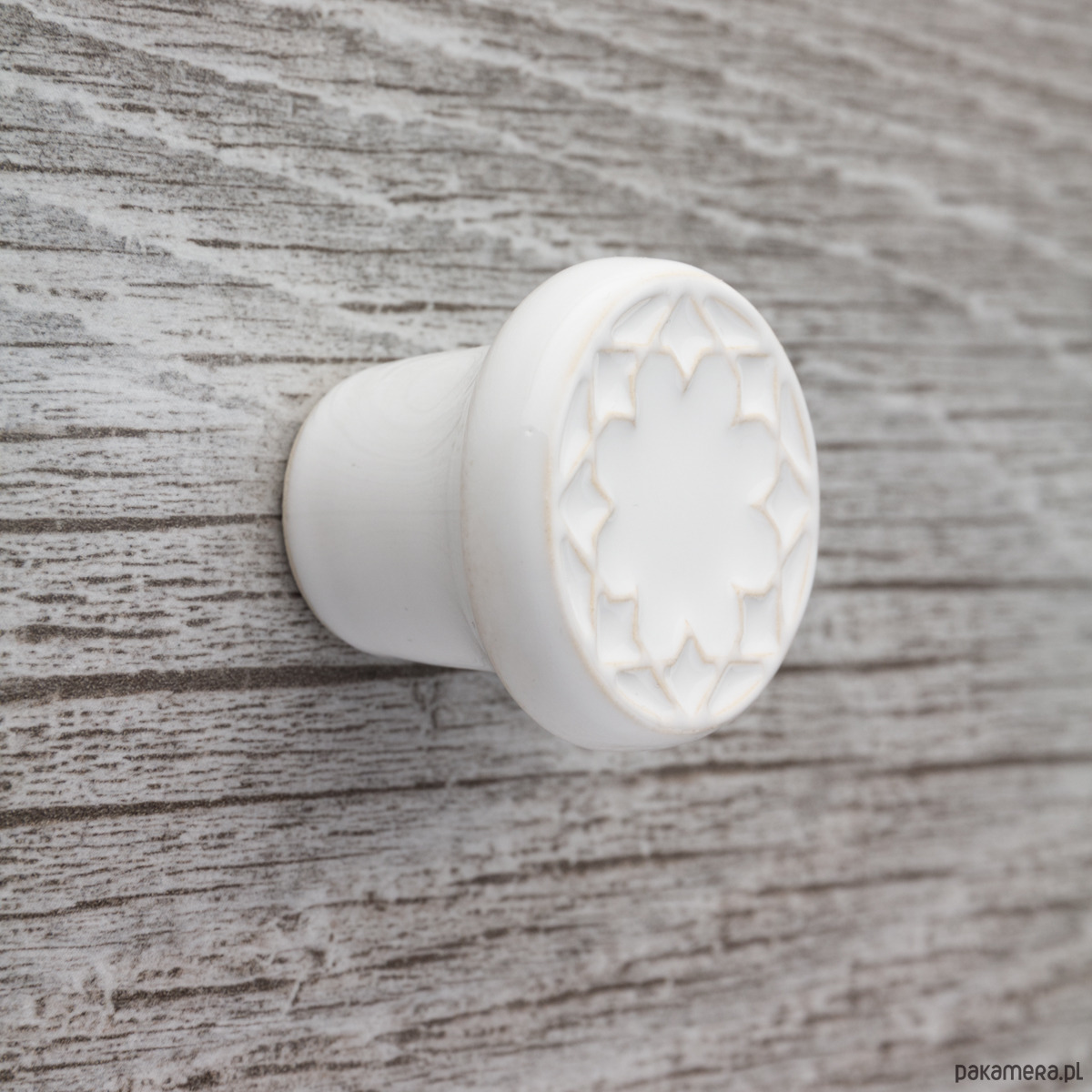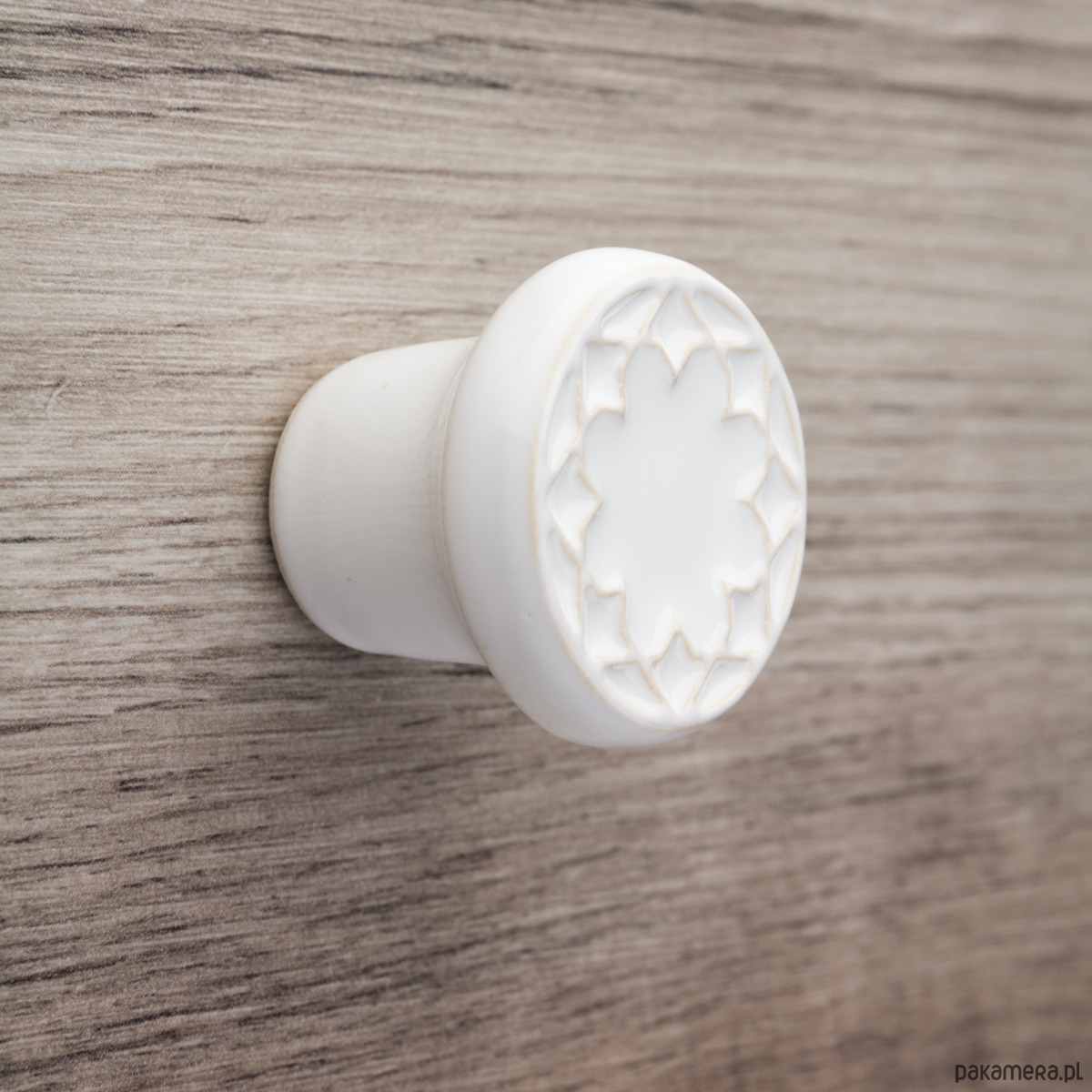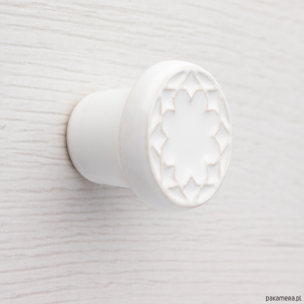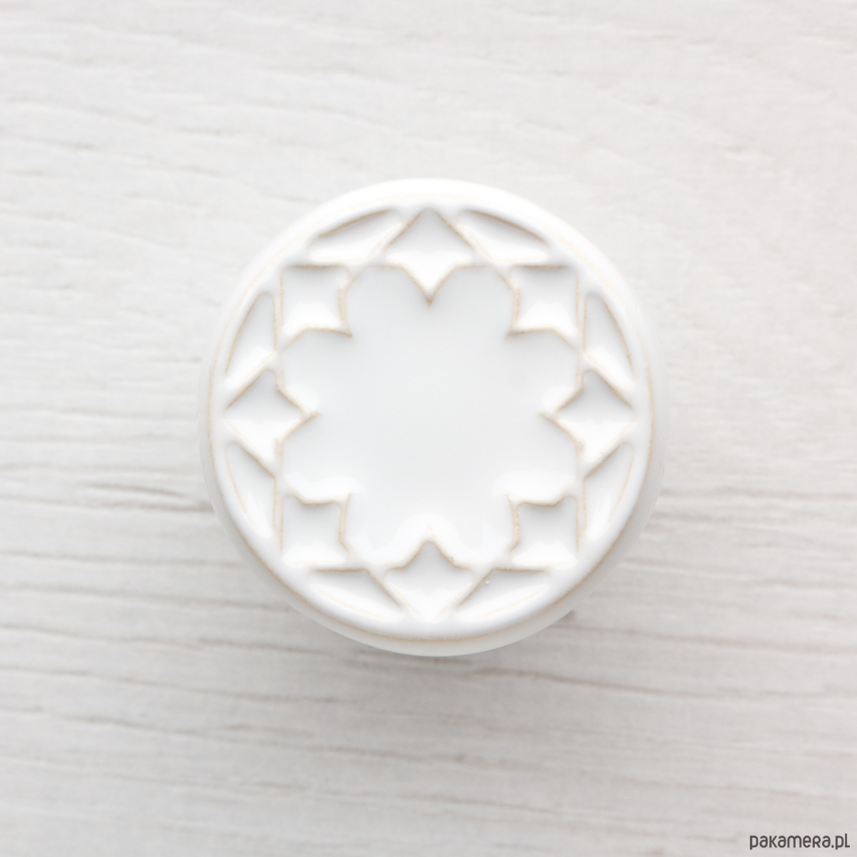 Ceramiczna gałka do mebli z lekko wypukłym ornamentem. Ręcznie wykonana z jasnej gliny, ręcznie szkliwiona, wypalona dwukrotnie w wysokiej temperaturze. Twoje meble zyskają nowy, niepowtarzalny, jedyny w swoim rodzaju wygląd.