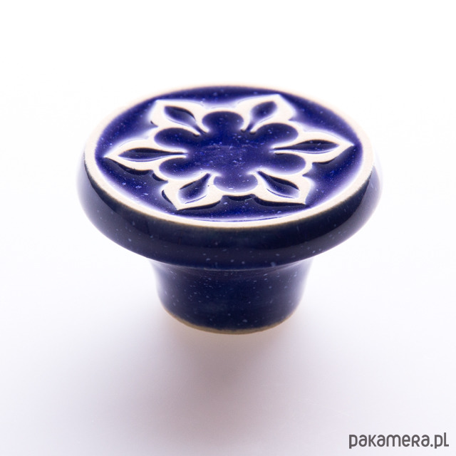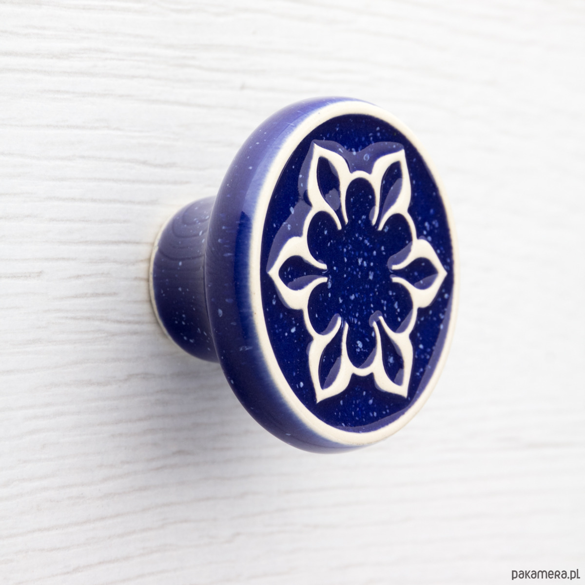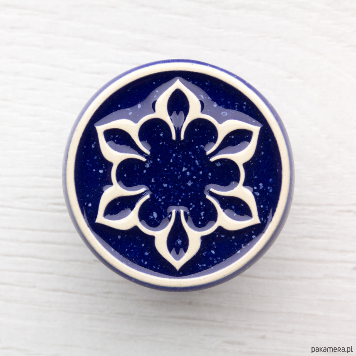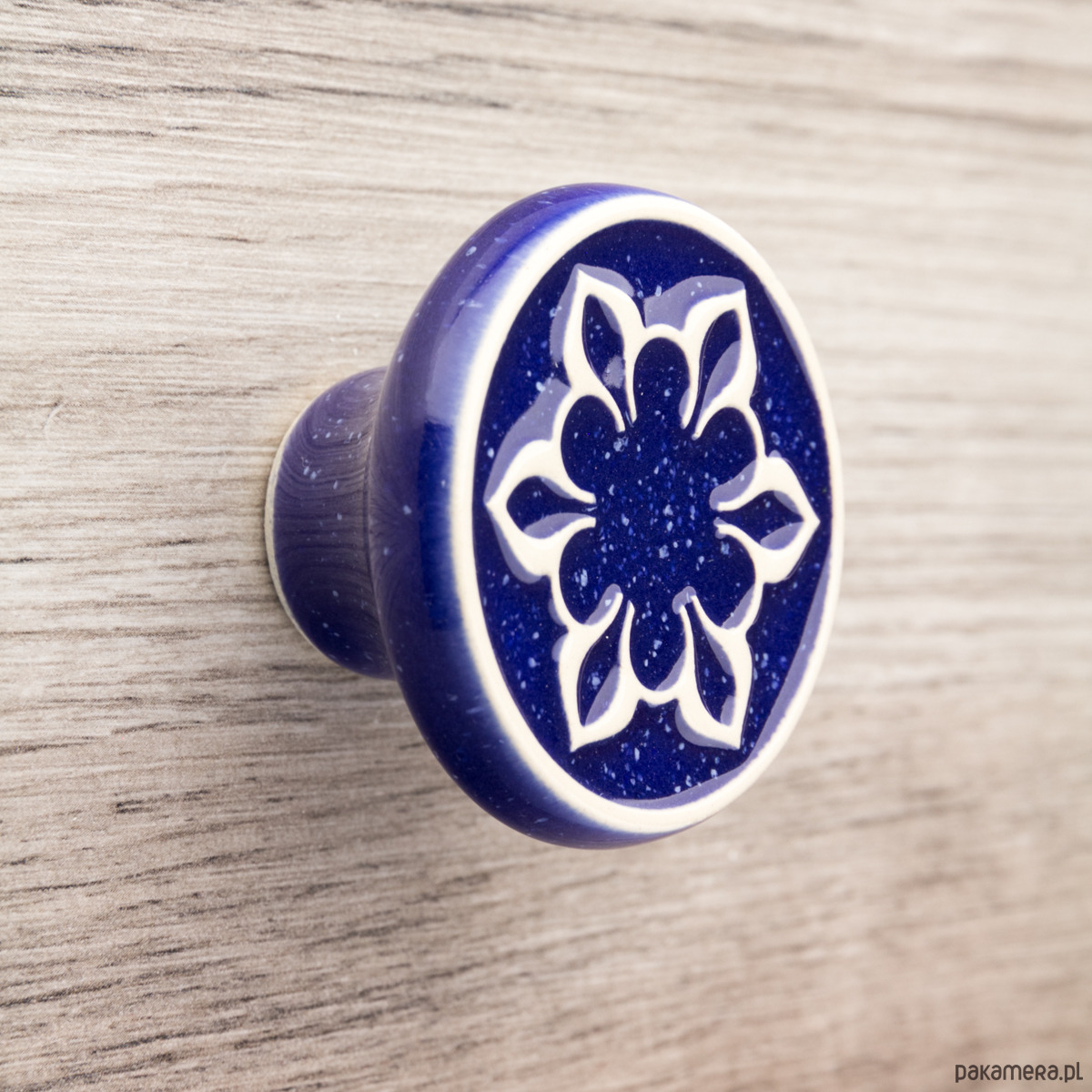 Ceramiczne gałki do mebli - ręcznie wykonane, ornamentowe, wg własnego projektu. Wykonane z jasnej gliny, pokryte błyszczącym, ciemnoniebieskim szkliwem, wypalone dwukrotnie w wysokiej temperaturze.