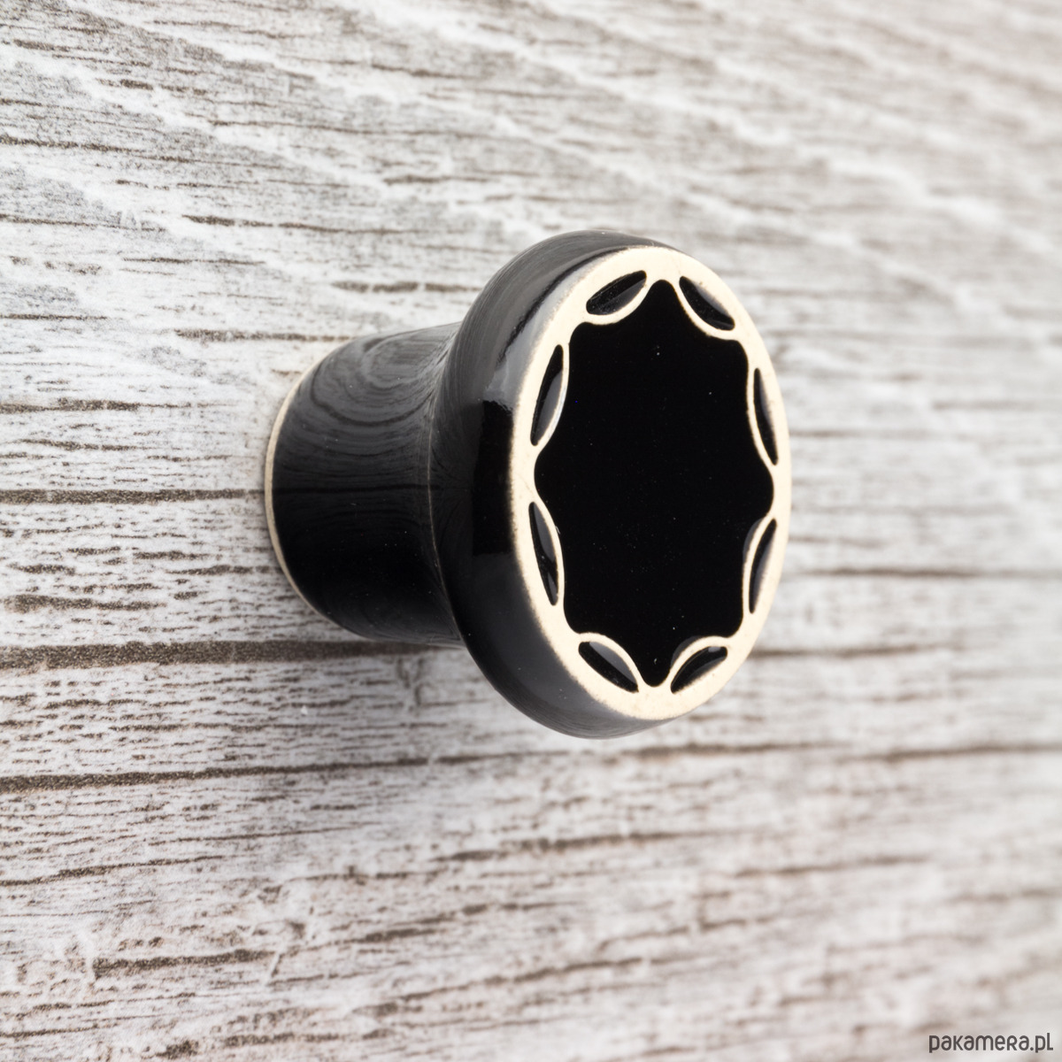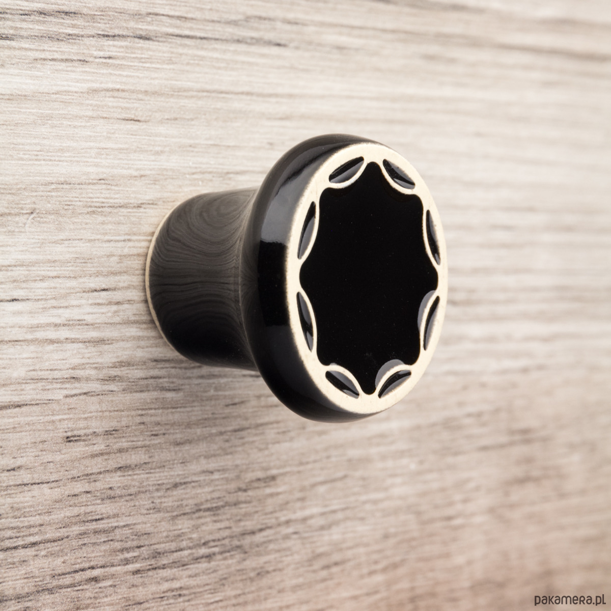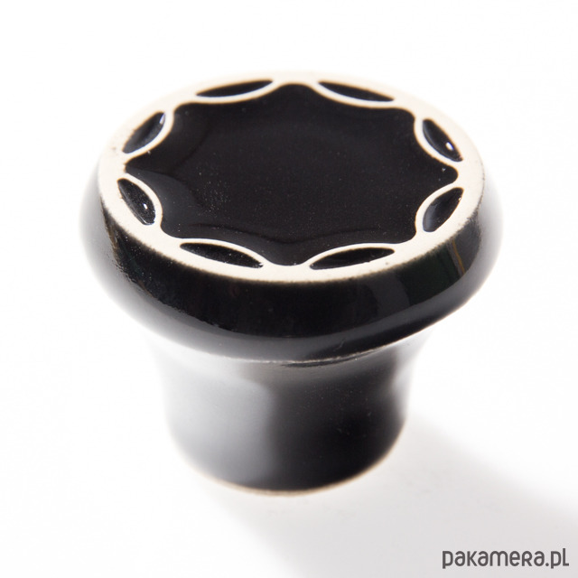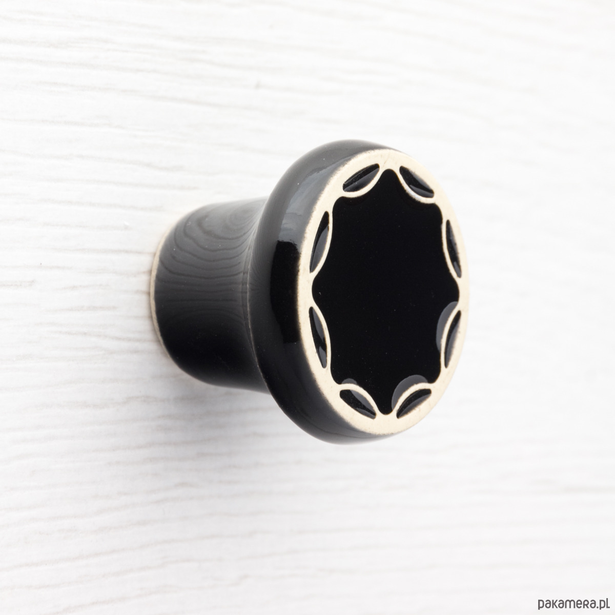 Ceramiczna gałka do mebli z lekko wypukłym ornamentem. Ręcznie wykonana z jasnej gliny, pokryta błyszczącym szkliwem, wypalona dwukrotnie w wysokiej temperaturze. Twoje meble zyskają nowy, niepowtarzalny, jedyny w swoim rodzaju wygląd.