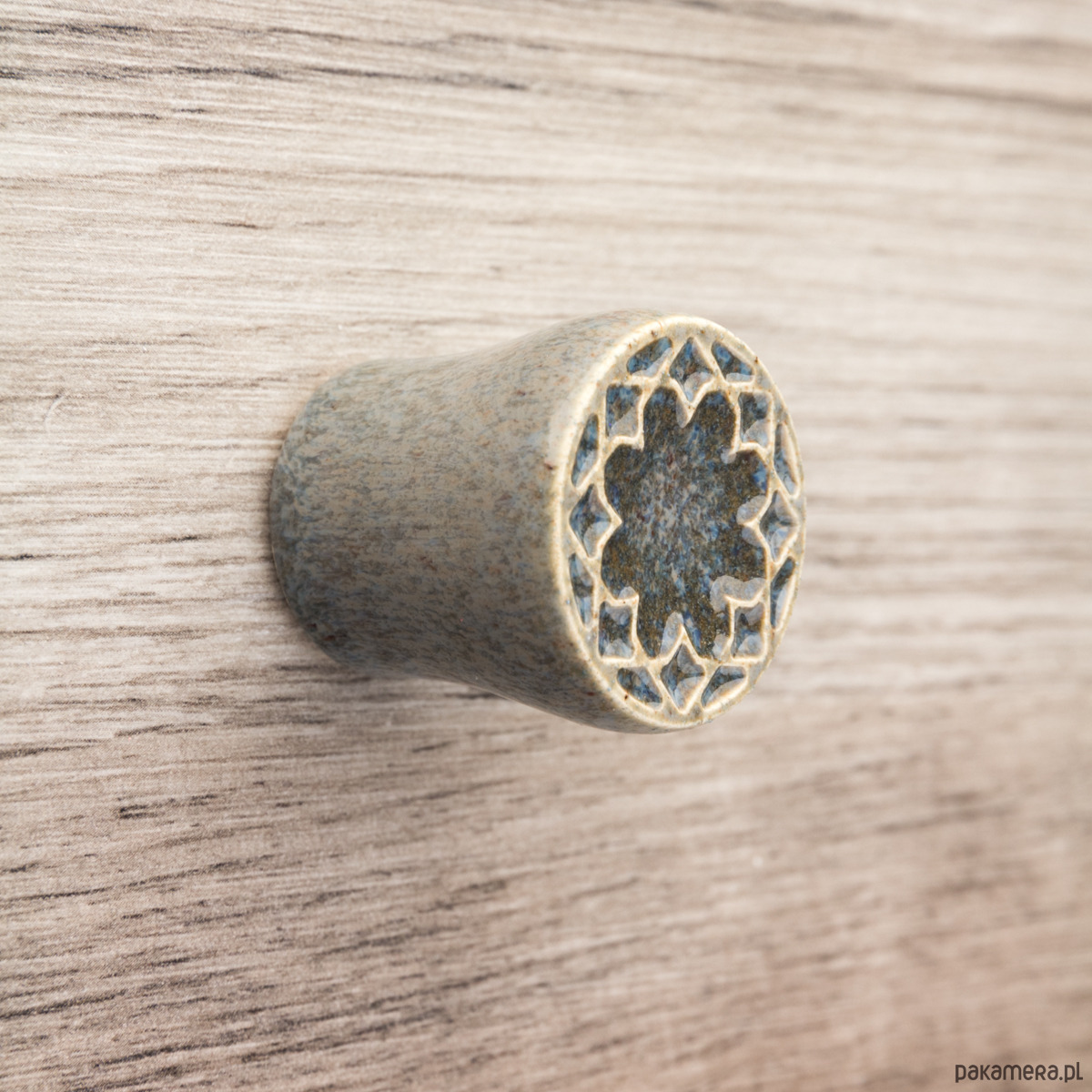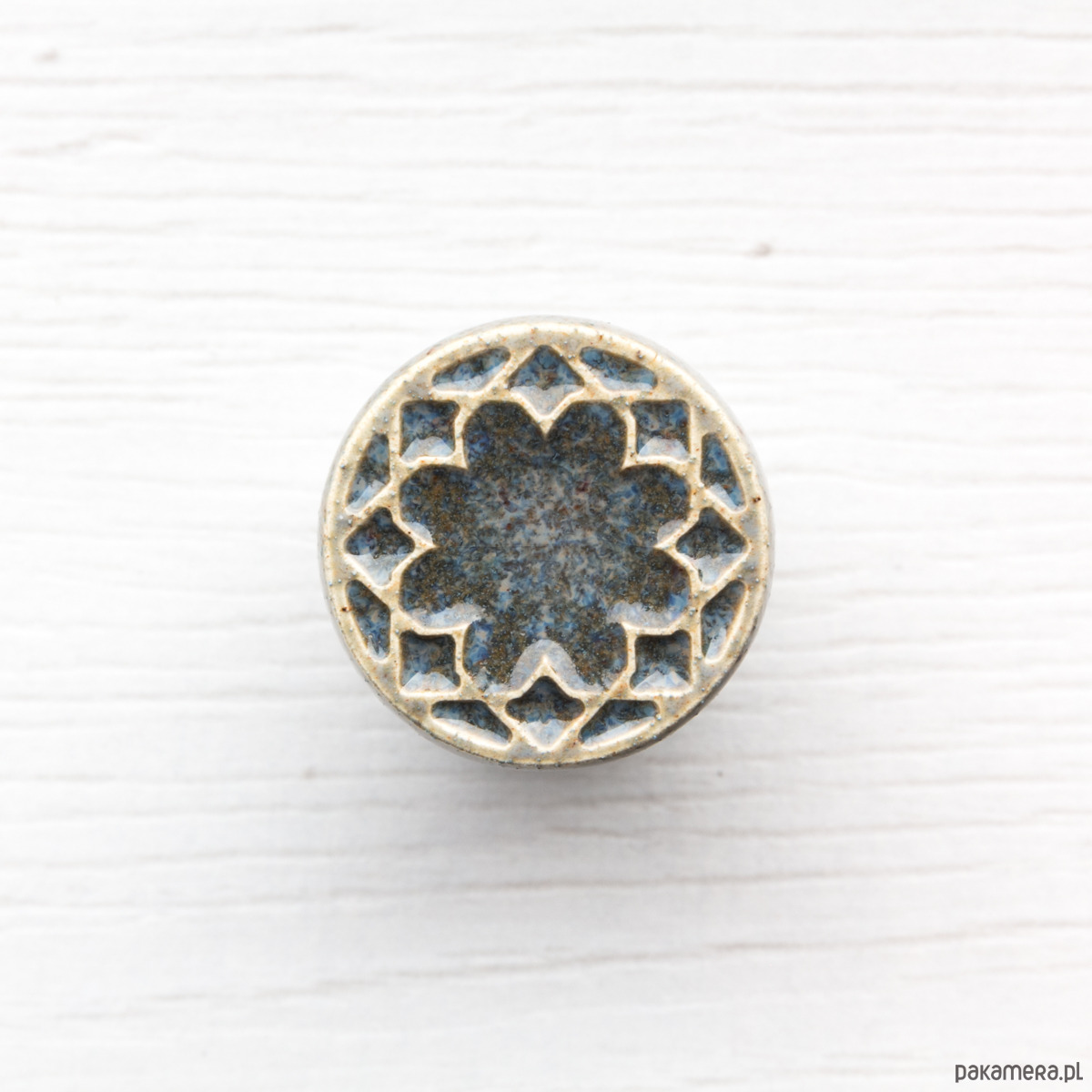 Ceramiczna gałka do mebli z lekko wypukłym ornamentem. Ręcznie wykonana z jasnej gliny, pokryta błyszczącym szkliwem. Twoje meble zyskają nowy, niepowtarzalny, jedyny w swoim rodzaju wygląd.