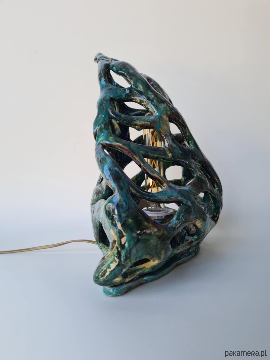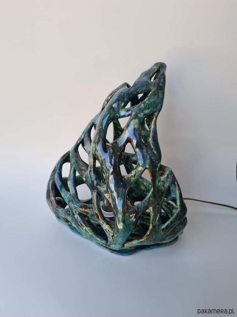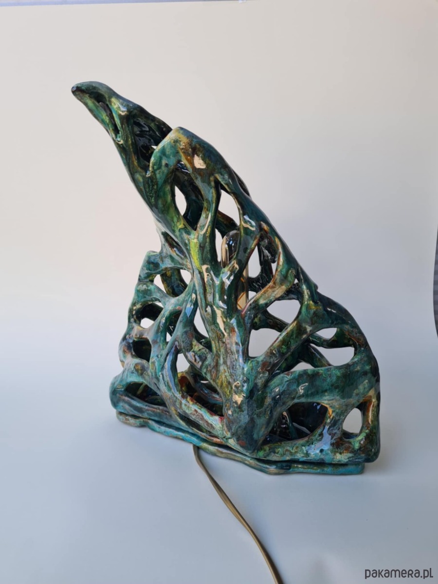 Ceramic leaf lamp This is a hand-made piece from start to finish by me. It is a very sculptural piece, but thanks to creating a table lamp out of it, it has become very useful. This piece consists of two parts, a removable lampshade and a base in which the bulb socket is placed. To obtain the appropriate color effects, I used my own technique of applying glazes. The piece was created in 2024. Dimensions Height 36 cm, width 23 cm, length 36 cm.