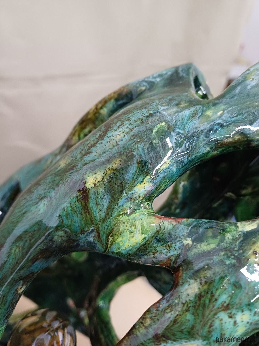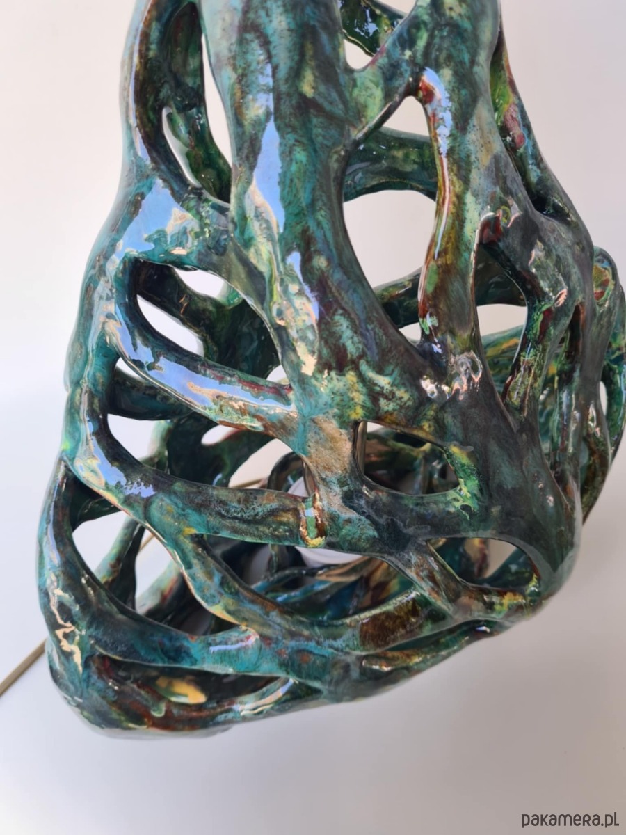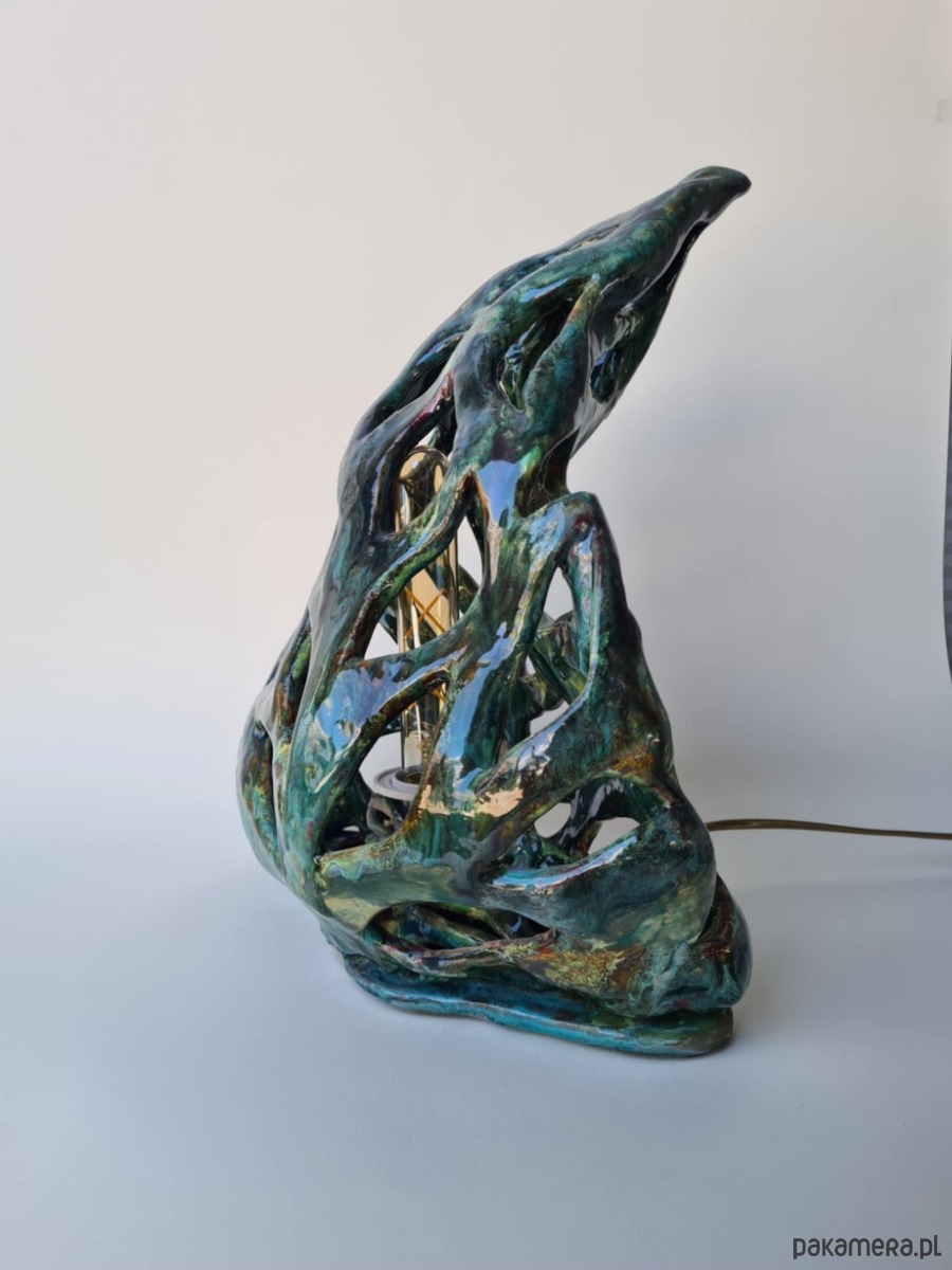 Ceramic leaf lamp This is a hand-made piece from start to finish by me. It is a very sculptural piece, but thanks to creating a table lamp out of it, it has become very useful. This piece consists of two parts, a removable lampshade and a base in which the bulb socket is placed. To obtain the appropriate color effects, I used my own technique of applying glazes. The piece was created in 2024. Dimensions Height 36 cm, width 23 cm, length 36 cm.