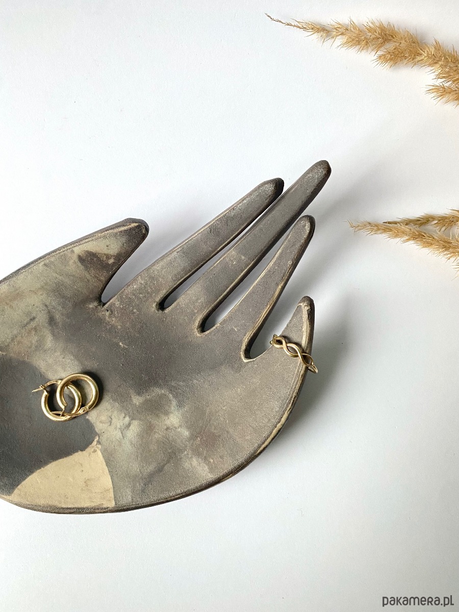 Gliniany talerzyk w kształcie łapki, nieszkliwiony, o surowej, lekko szorstkiej fakturze. Idealny na biżuterię, świeczkę herbacianą lub po prostu ukochane drobiazgi.