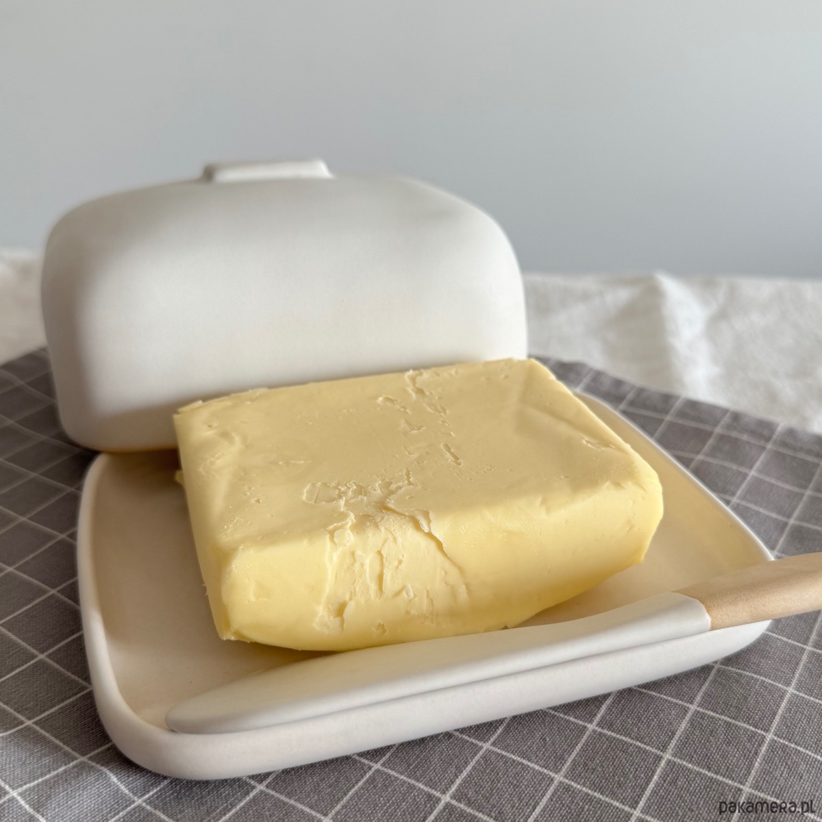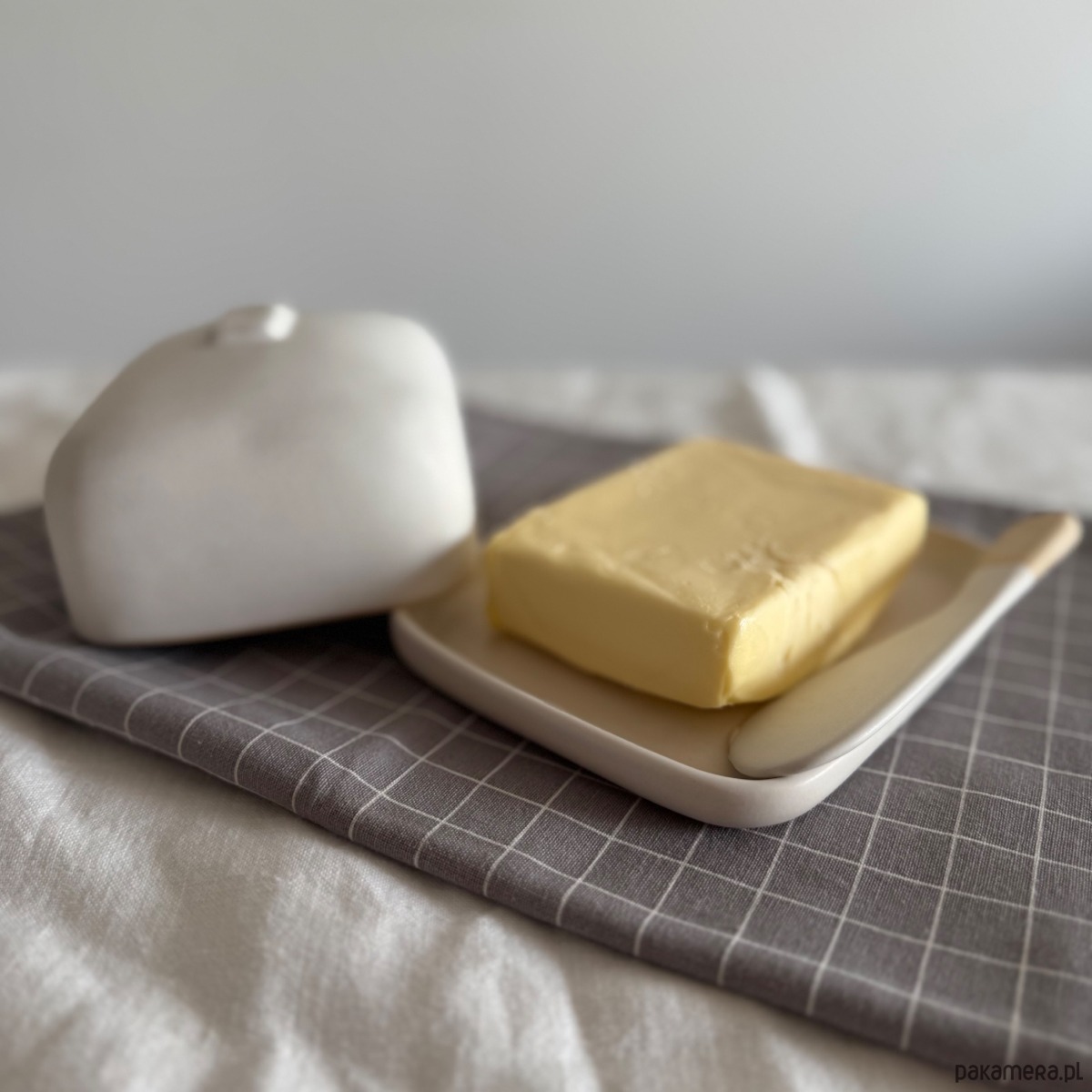 Naczynie wykończone jest białym, satynowym szkliwem, które pięknie rozprasza światło i nadaje formie delikatności. Zaokrąglona linia pokrywki sprawia, że prosta maselniczka nabiera dynamiki i charakteru – idealna do wnętrz nowoczesnych, skandynawskich czy minimalistycznych.
