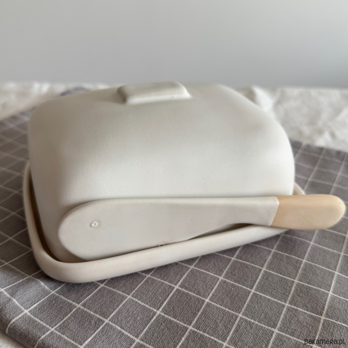 Ręcznie robiona maselniczka z ceramiki to połączenie funkcjonalności i nowoczesnego designu. Składa się z podstawki, na której mieści się cała kostka masła (200 g), oraz pokrywki idealnie pasującej do dłoni żeby ją wygodnie zdjąć.