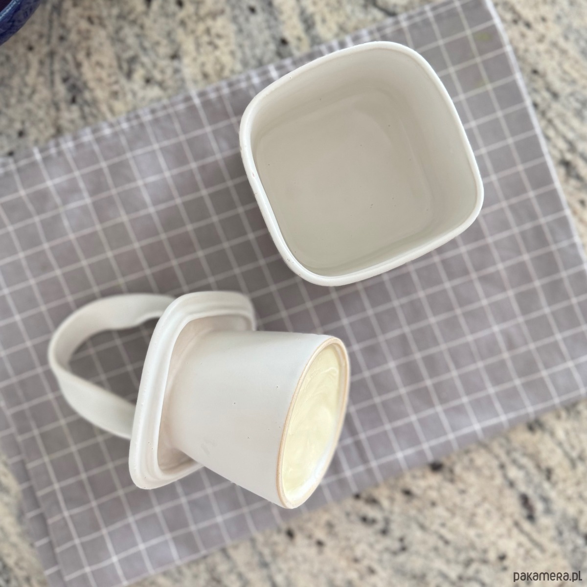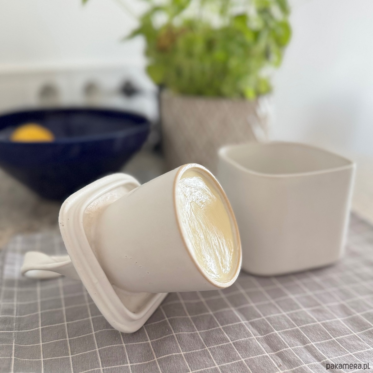 Ręcznie robiona maselniczka z ceramiki to połączenie funkcjonalności i nowoczesnego designu. Składa się z podstawki przeznaczonej do trzymania wody oraz pokrywki, w której mieści się około 150 g masła. Pokrywka jest ozdobiona subtelną, ceramiczną wstążką, pełniącą także rolę wygodnego uchwytu. W tej maselniczce masło zawsze pozostaje świeże i miękkie.