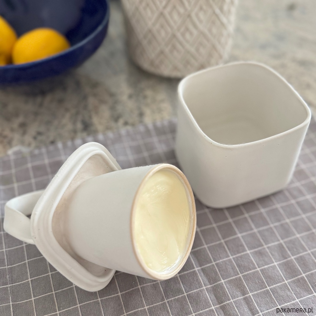 Naczynie wykończone jest białym, satynowym szkliwem, które pięknie rozprasza światło i nadaje formie delikatności. Falista linia pokrywki sprawia, że prosta maselniczka nabiera dynamiki i charakteru – idealna do wnętrz nowoczesnych, skandynawskich czy minimalistycznych.