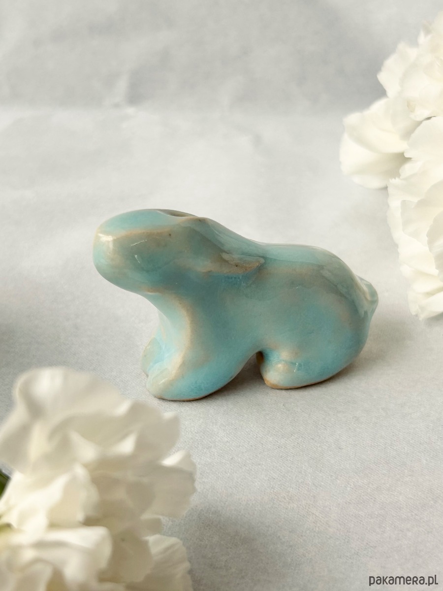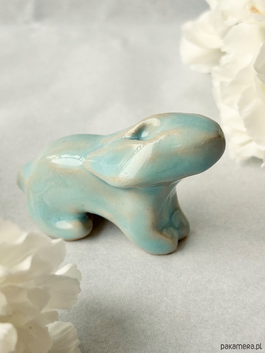 Miniaturowa figurka, ceramiczny zając, lepiona ręcznie z czułością i uważnością.