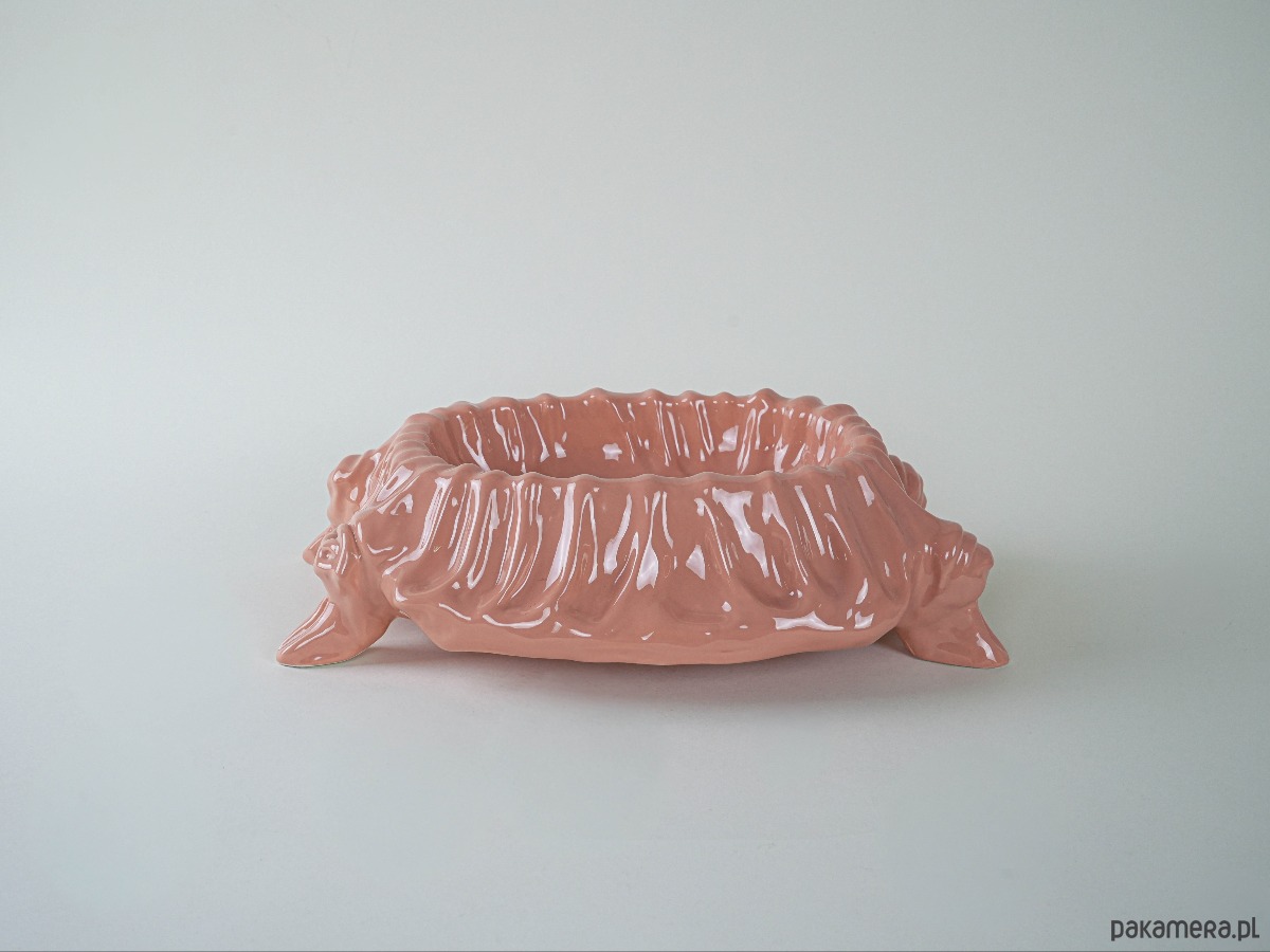 Rzeźbiarska misa z ceramiki szkliwionej. Organiczna, drapowana forma przypomina miękką tkaninę uchwyconą w ruchu, a łososiowy kolor dodaje jej wyrazistości i elegancji. Zarówno użytkowa, jak i kolekcjonerska – może pełnić funkcję misy dekoracyjnej, rzeźby lub centralnego punktu aranżacji wnętrza.