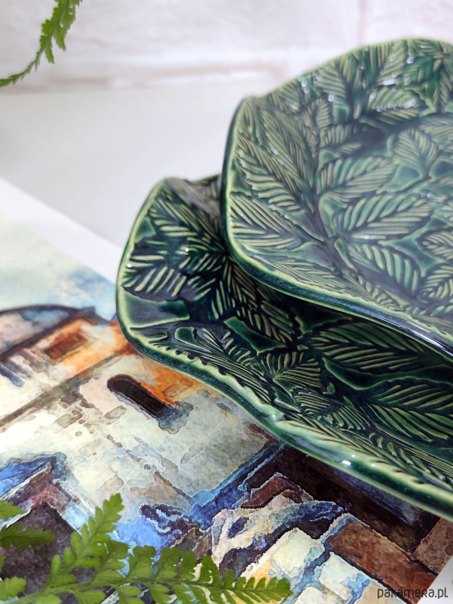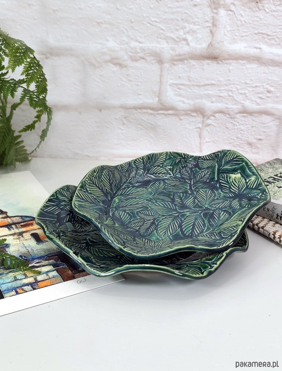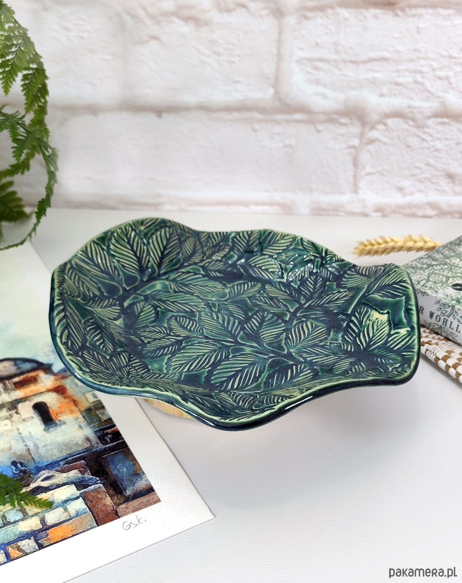Ręcznie formowana misa ceramiczna z fakturą liści, wykończona błyszczącym szkliwem w kolorze głębokiej zieleni. Może służyć jako stylowy pojemnik na biżuterię, owoce lub samodzielna ozdoba stołu, dodająca elegancji i naturalnego uroku każdemu pomieszczeniu.