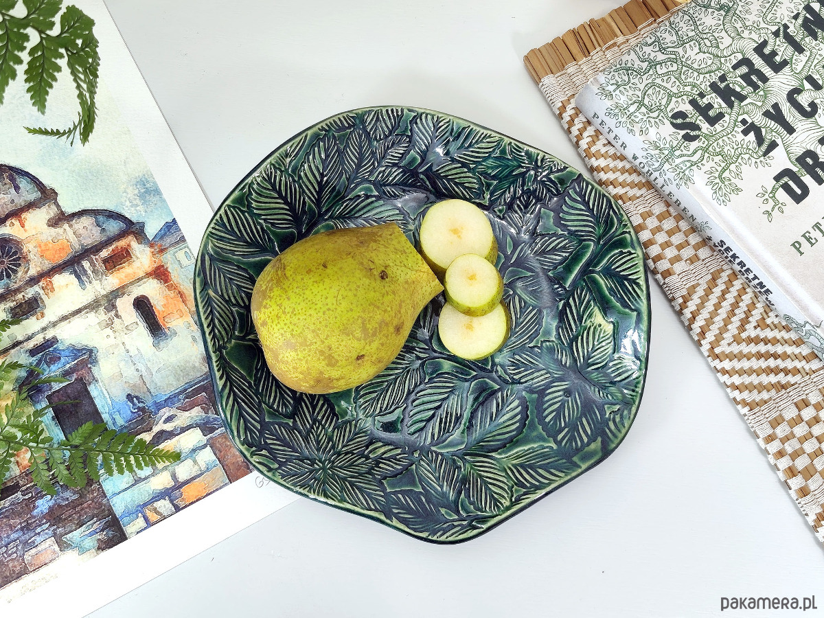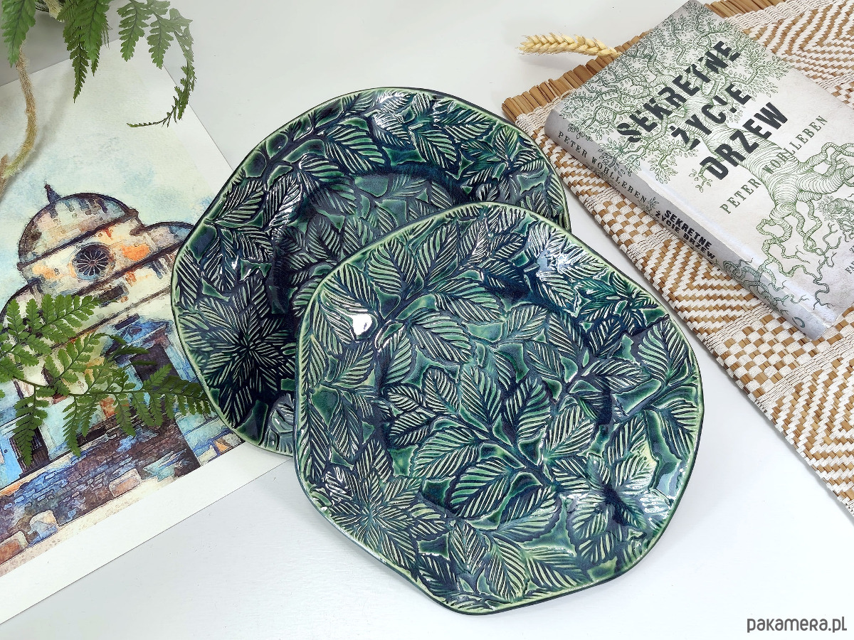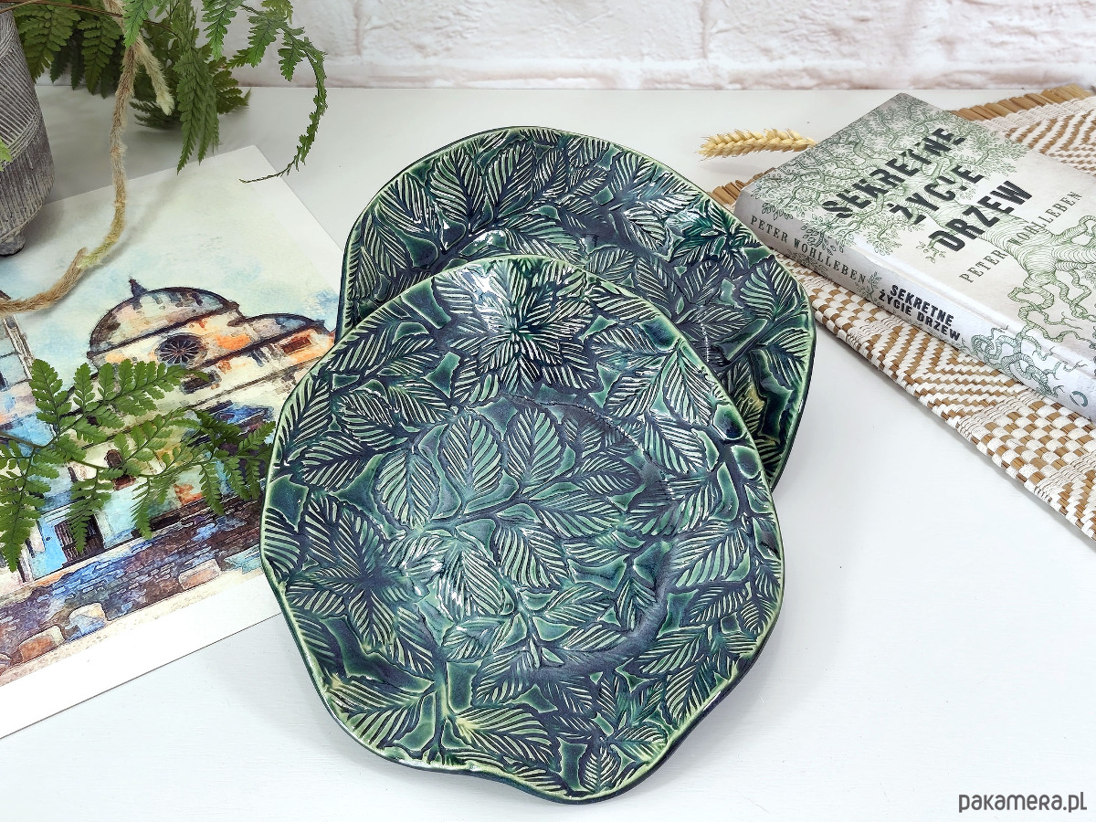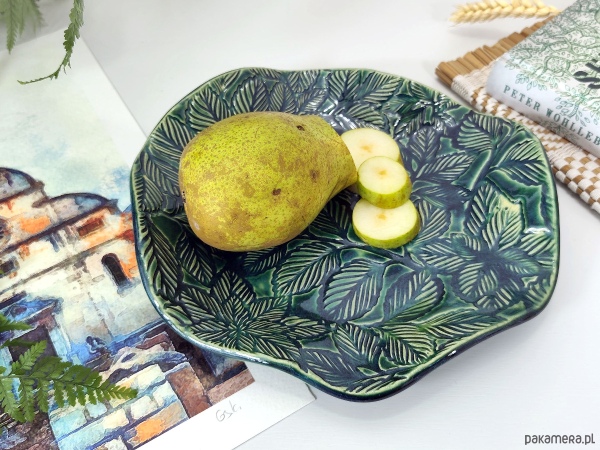 Ręcznie formowana misa ceramiczna z fakturą liści, wykończona błyszczącym szkliwem w kolorze głębokiej zieleni. Może służyć jako stylowy pojemnik na biżuterię, owoce lub samodzielna ozdoba stołu, dodająca elegancji i naturalnego uroku każdemu pomieszczeniu.