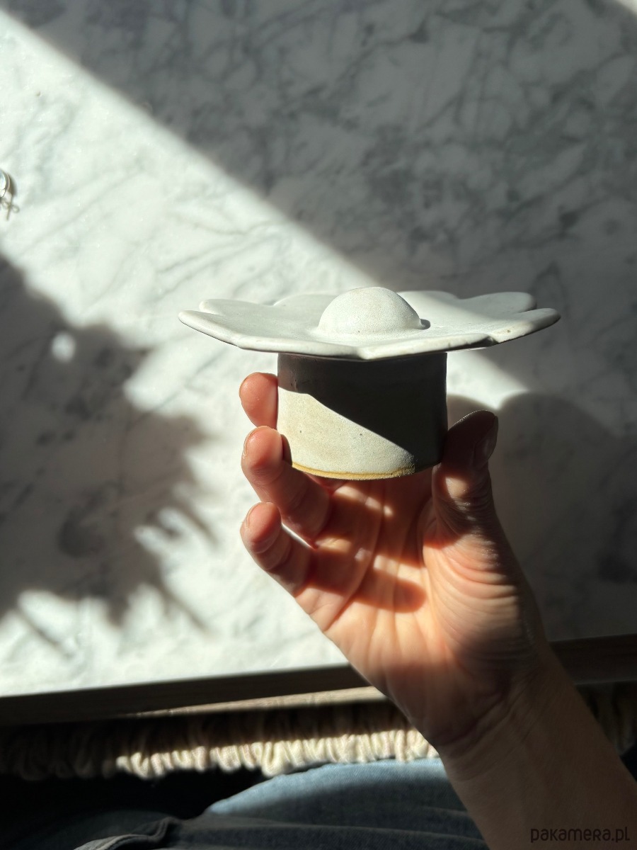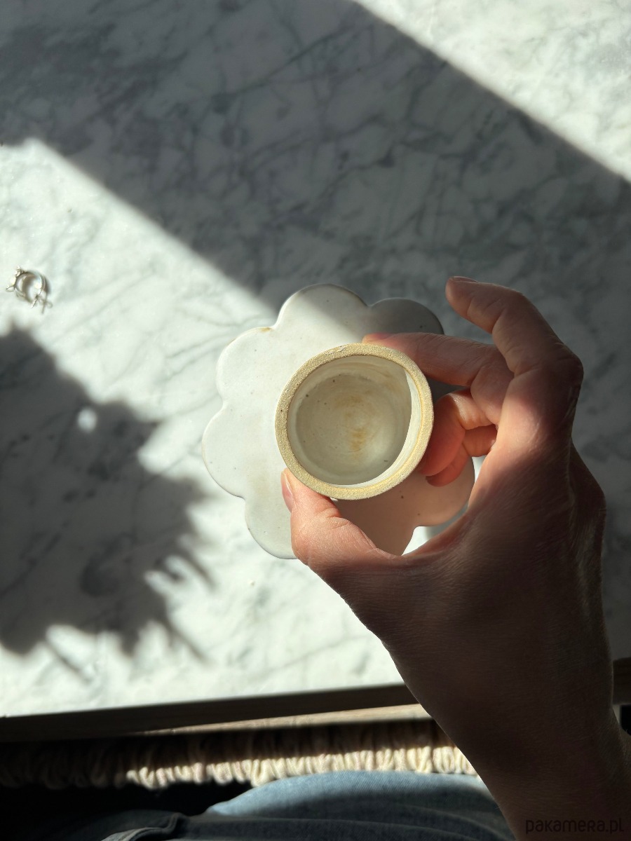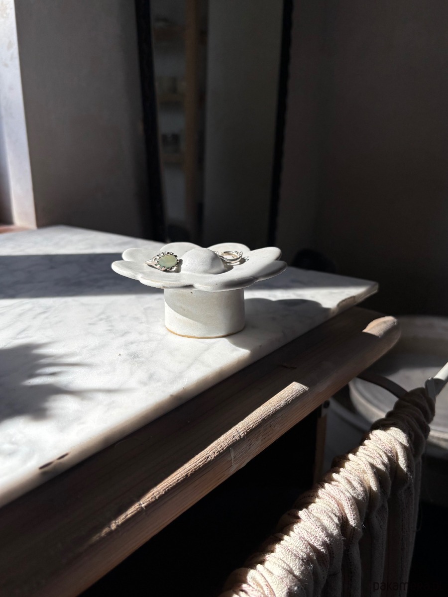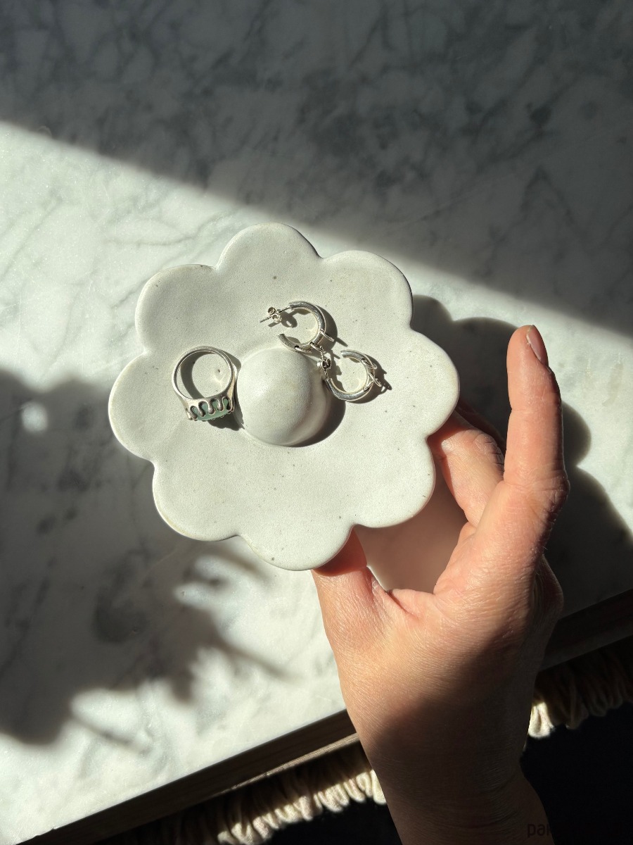 Ceramiczna miseczka w kształcie kwiatu – ręcznie lepiona i szkliwiona. Idealna na biżuterię, pierścionki czy drobne skarby, które chcesz mieć zawsze pod ręką. Dzięki niej ukończysz dzień bez szukania zagubionej biżuterii, a jej nowoczesny, a jednocześnie organiczny kształt wniesie do wnętrza świeżość i subtelny design.