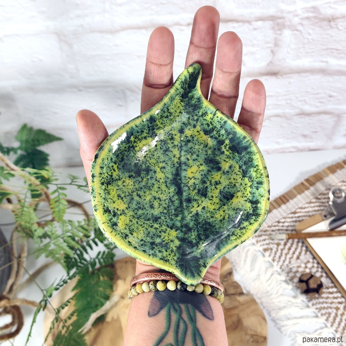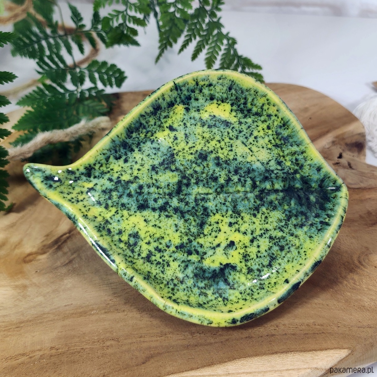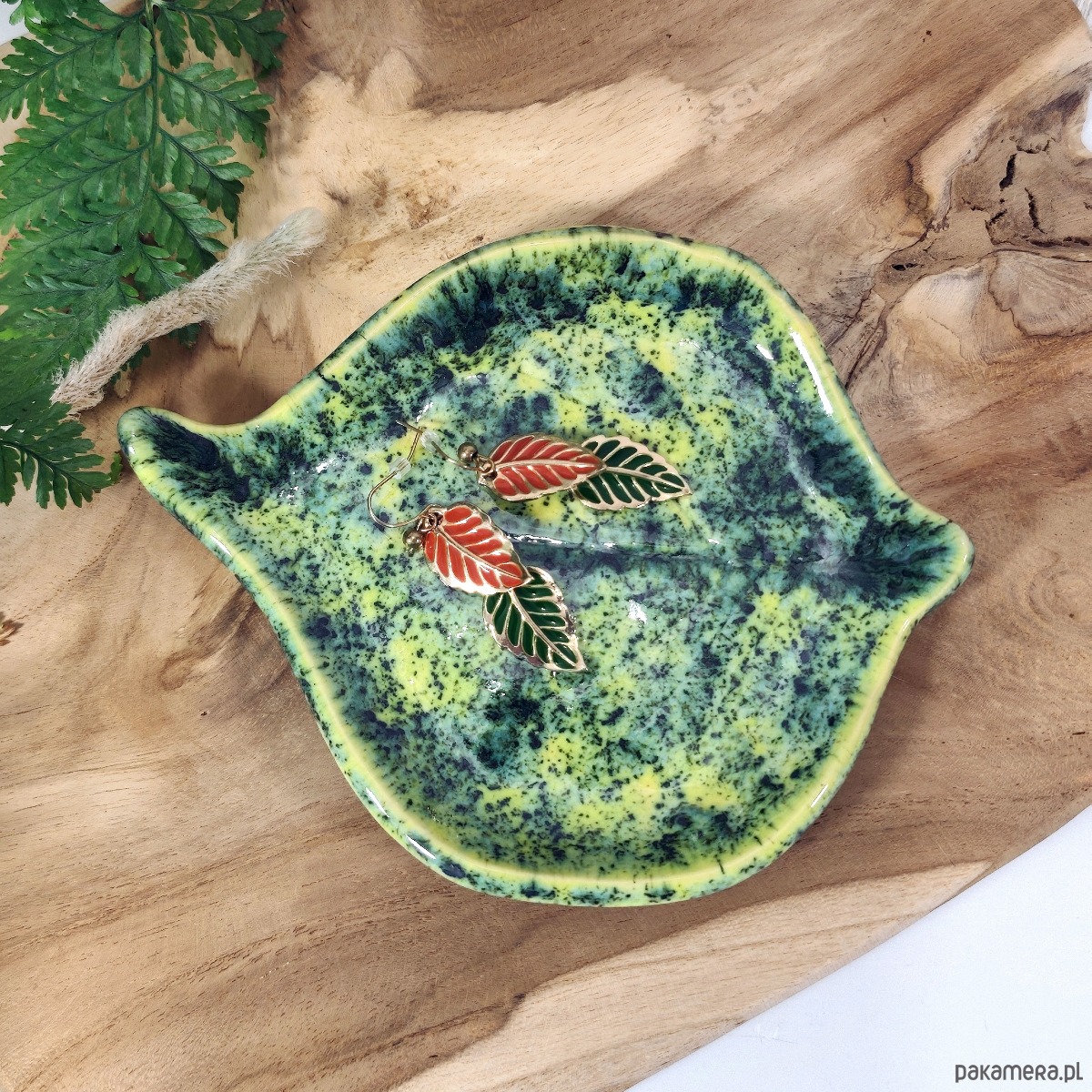 Wielofunkcyjna miseczka ceramiczna w kształcie liścia o soczystym, zielono-limonkowym kolorze z unikalnym efektem nakrapiania. Idealna jako praktyczna podstawka pod łyżkę w kuchni, podstawka pod świecę lub elegancki talerzyk na biżuterię przy sypialnianej toaletce.