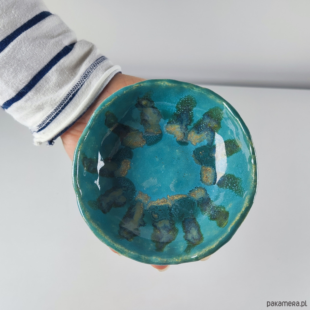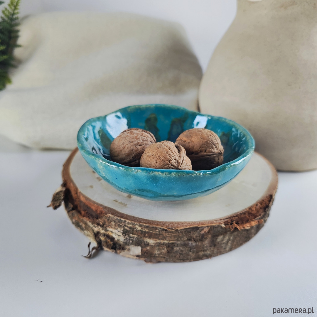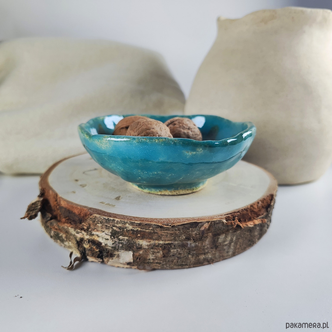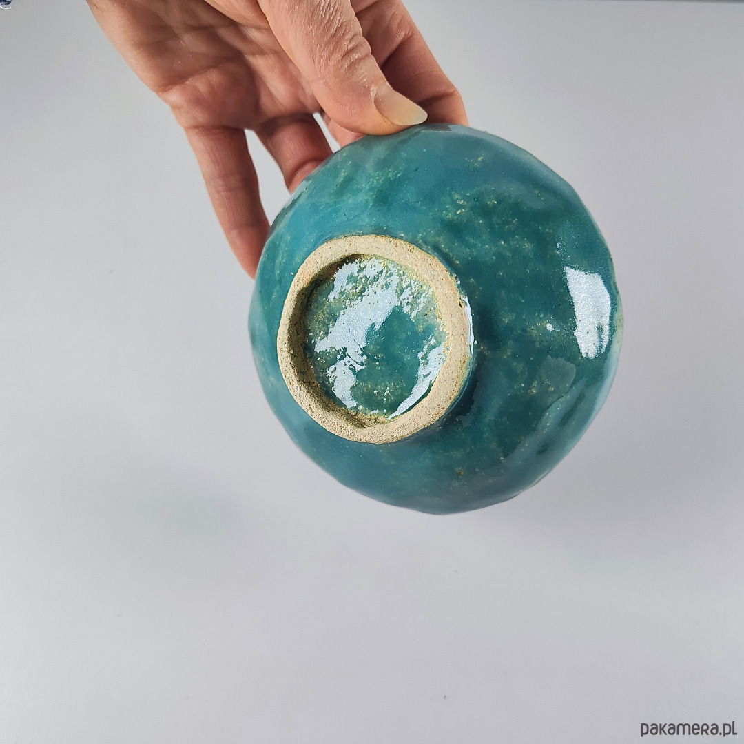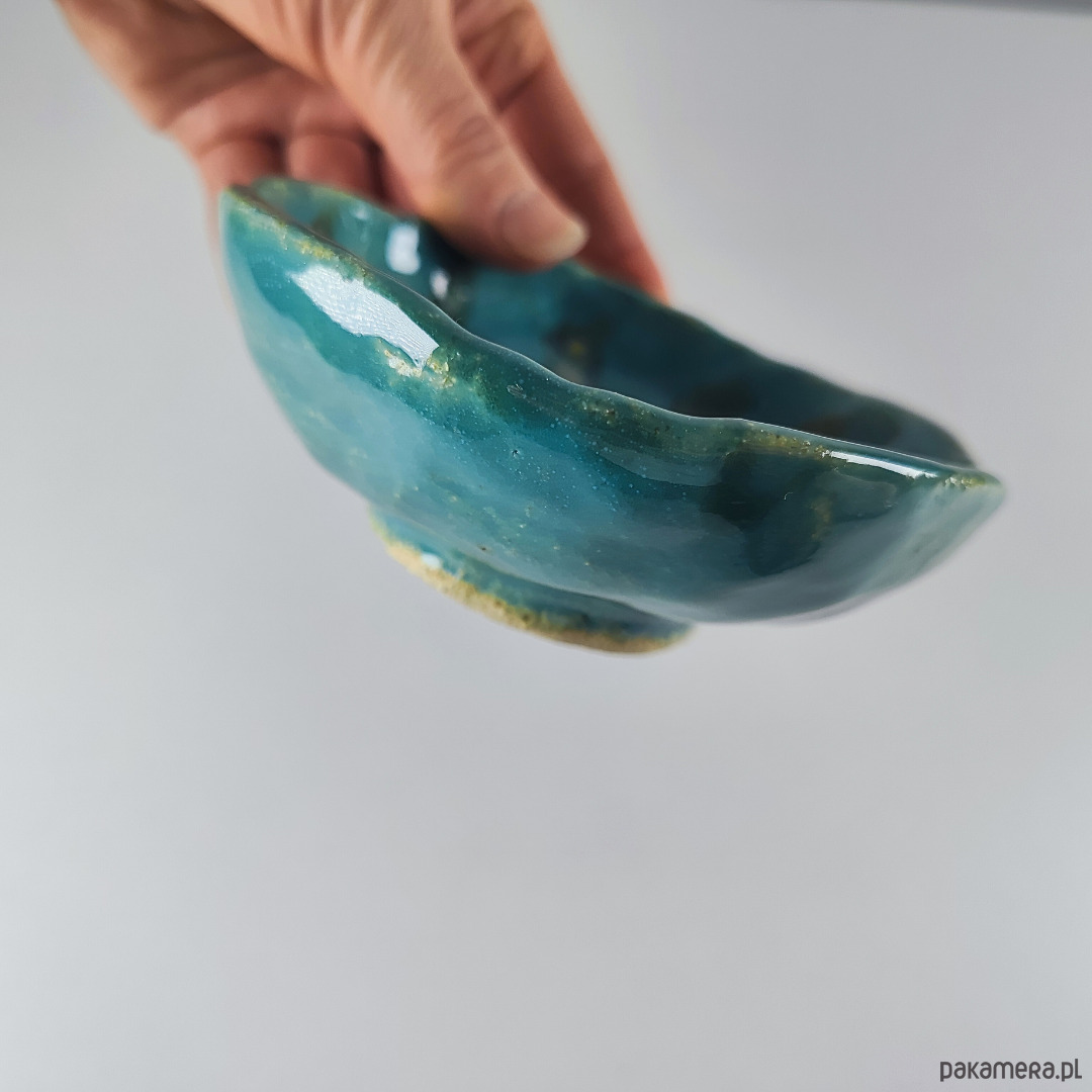Ręcznie lepiona miseczka z masy szamotowej w kolorze morskimi.
