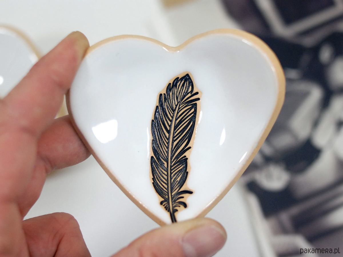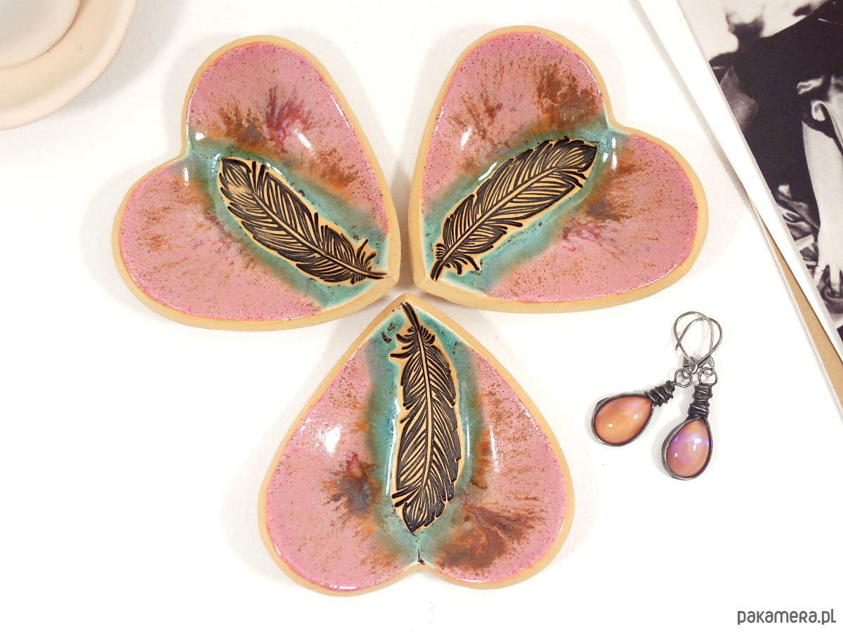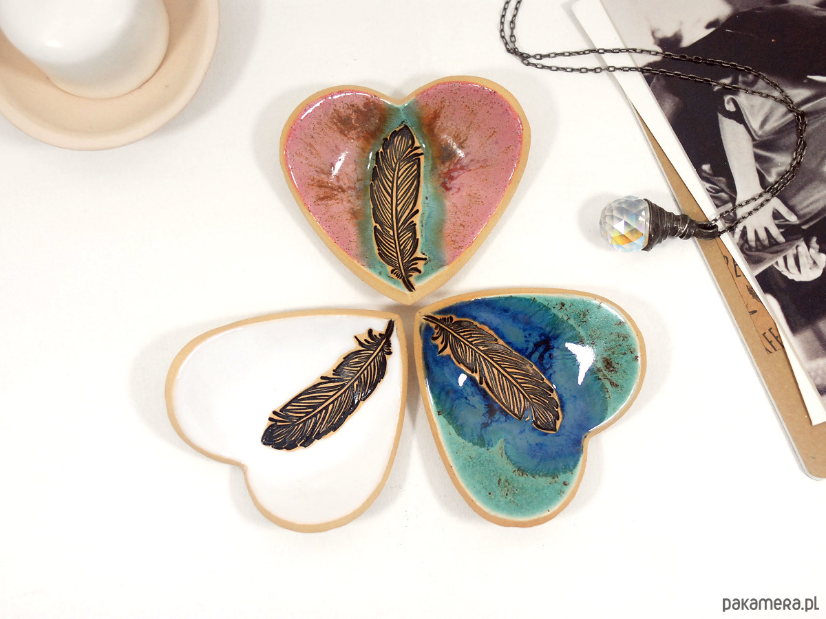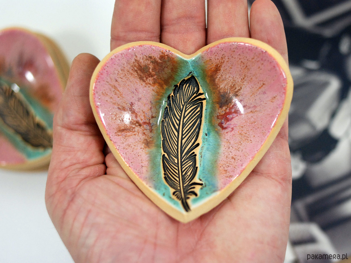 Ceramiczna miseczka serce z piórkiem - talerzyk na biżuterię