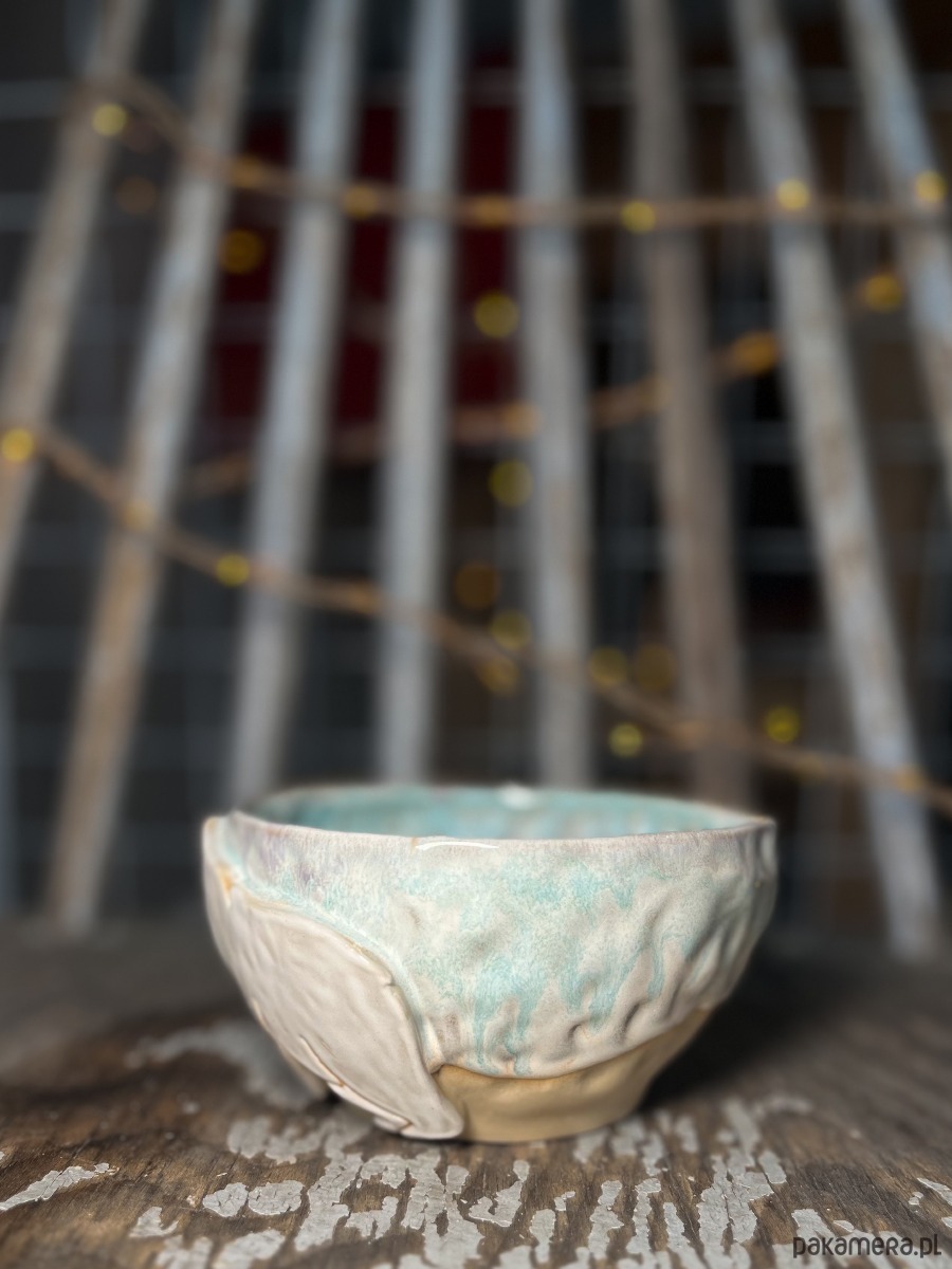 Ręcznie lepiona i szkliwiona ceramiczna miseczka, z autorską płaskorzeźbą Niedźwiedzia Polarnego.