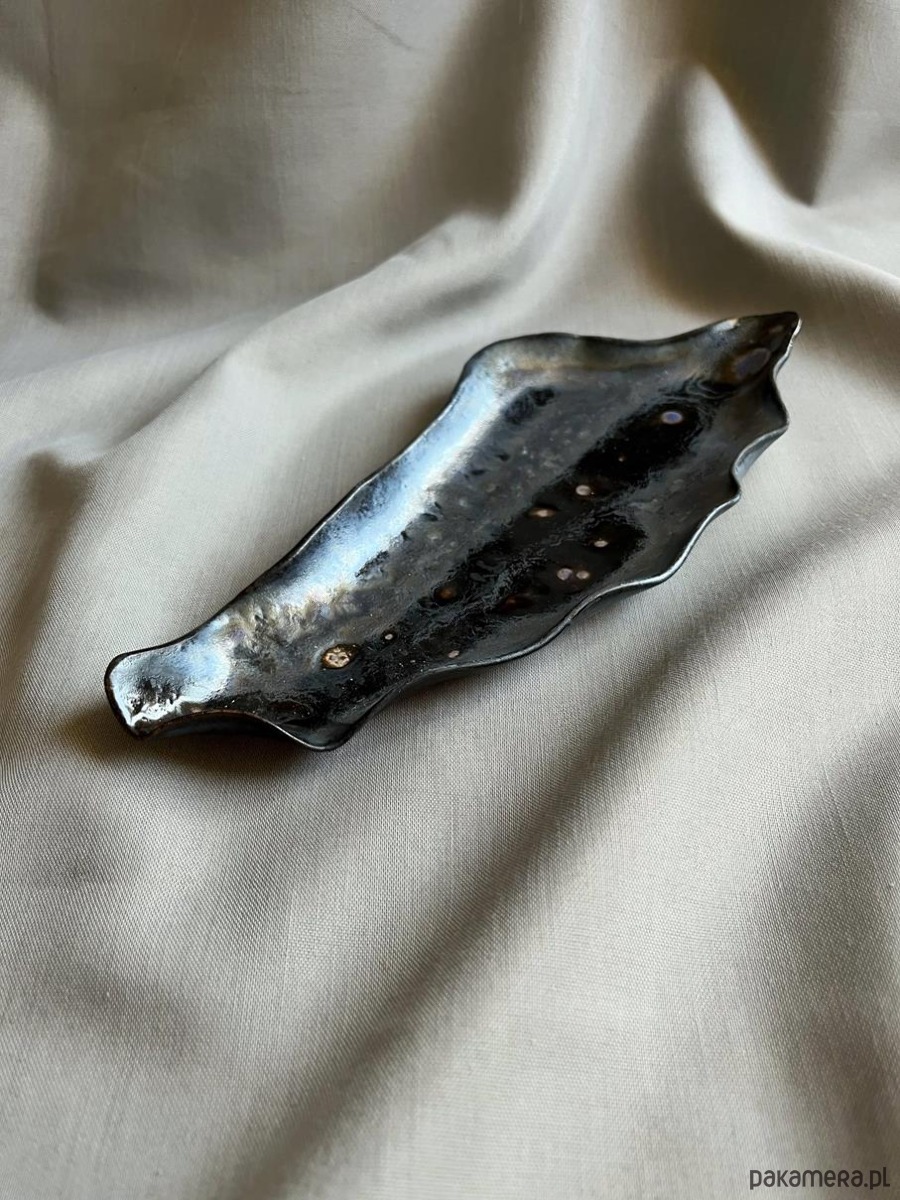 Zmysłowa, niebanalna i całkowicie ręcznie wykonana – podstawka ceramiczna w kształcie muszli/ostrygi przyciąga wzrok eleganckim czarnym szkliwem z subtelnym, brokatowym blaskiem.