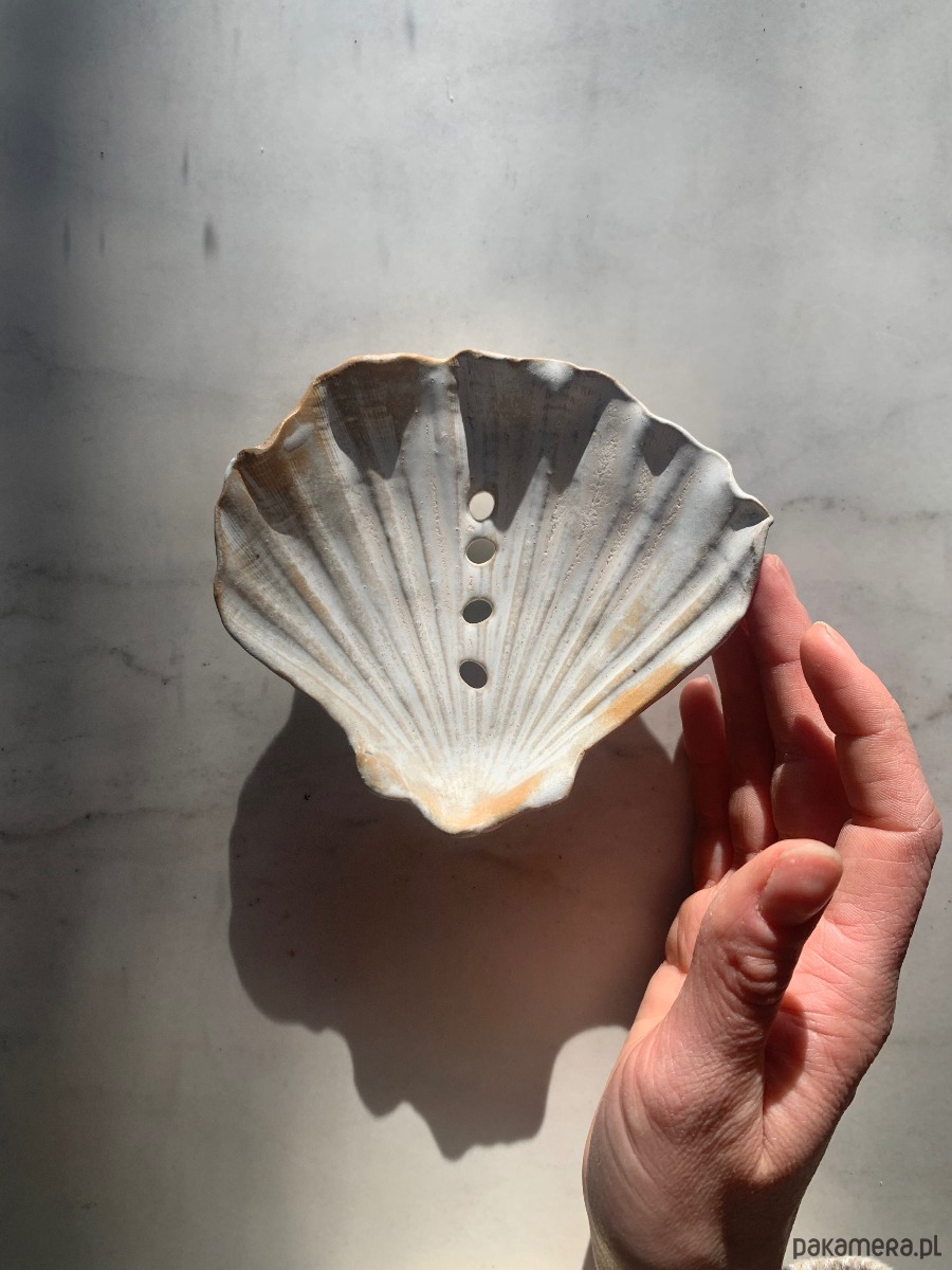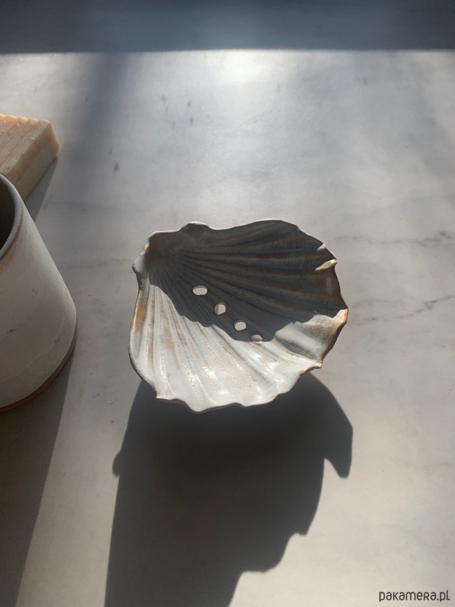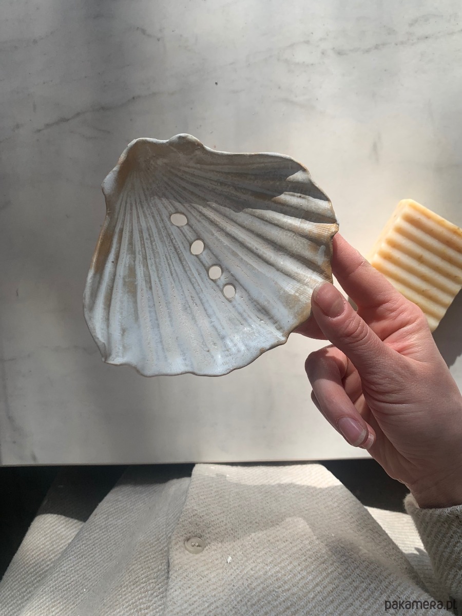 Ceramiczna ręcznie stworzona mydelniczka w kształcie muszelki z dziurkami i na nóżkach, co gwarantuje odpływ wody.