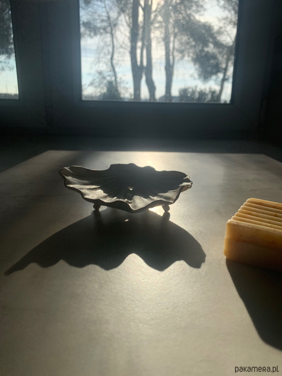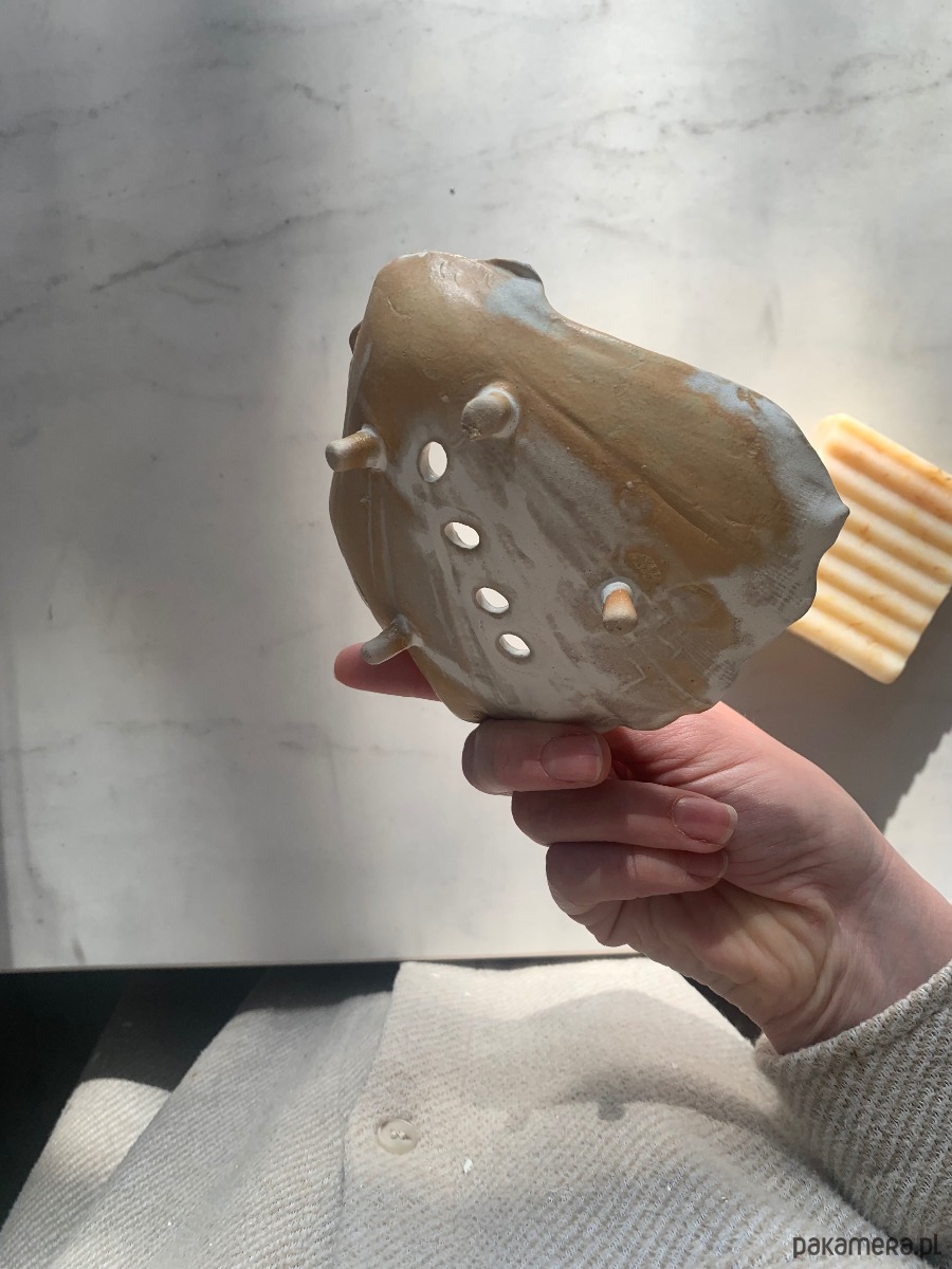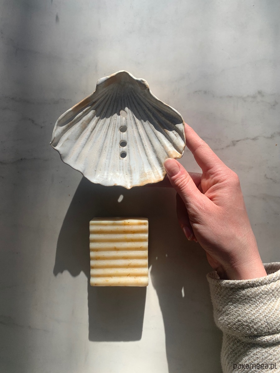 Ceramiczna ręcznie stworzona mydelniczka w kształcie muszelki z dziurkami i na nóżkach, co gwarantuje odpływ wody.