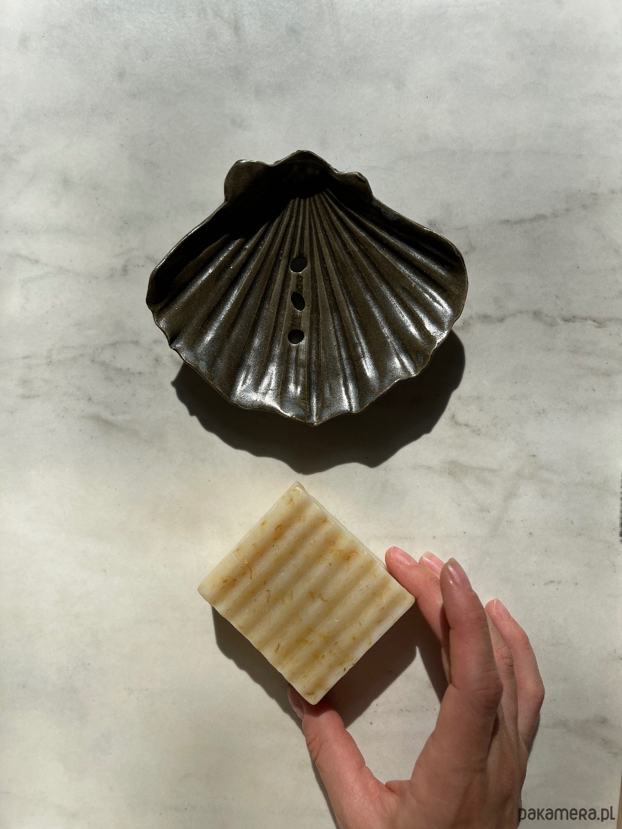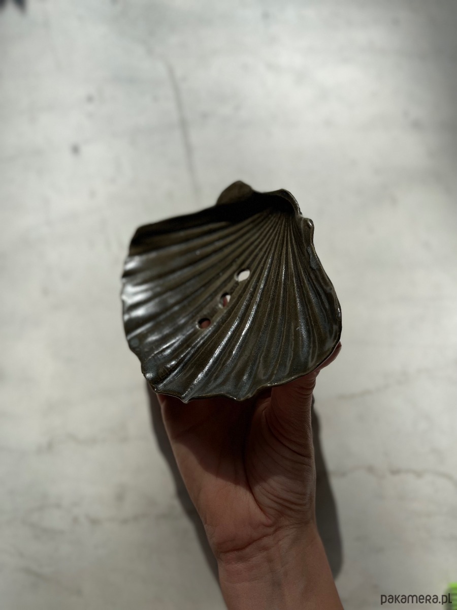 Ceramiczna ręcznie stworzona mydelniczka w kształcie muszelki o nieregularnych kształtach.