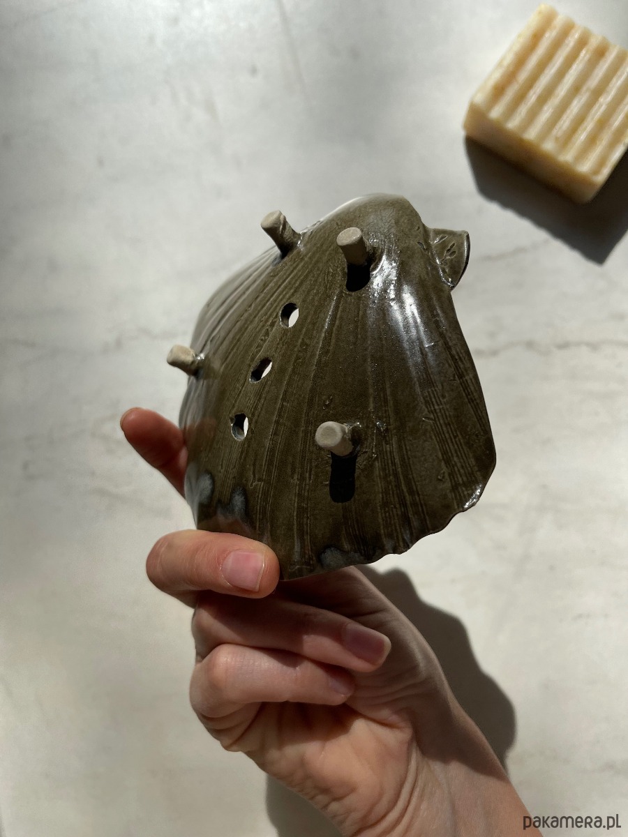 Mydelniczka ma mini nóżki, jest ulepiona i poszkliwiona ręcznie przez Moni, założycielkę marki Maison Fragile :) Każda jest tworzona oddzielnie, bez użycia form, w związku z czym każdy przedmiot jest unikatowy, noszący ślady rzemieślniczej pracy. Jest to idealny pomysł na prezent dla bliskiej osoby