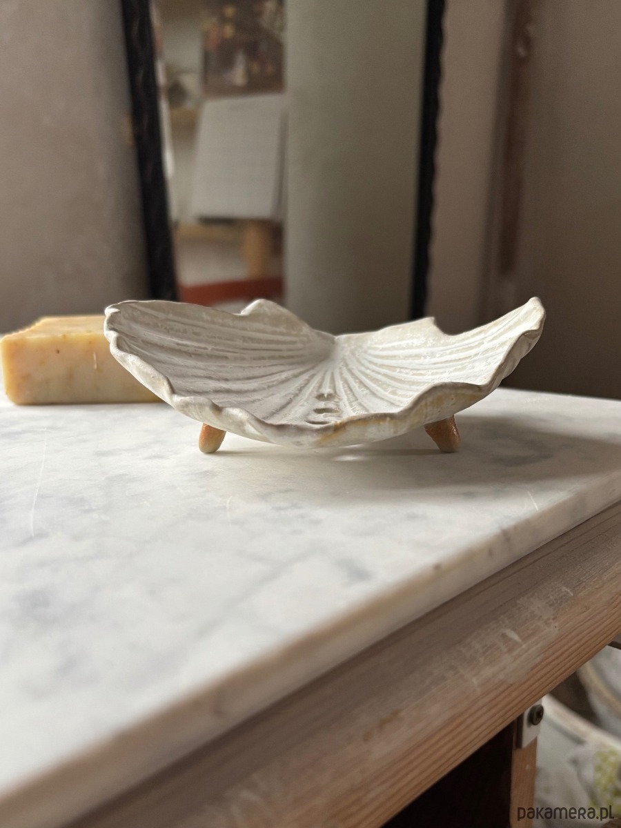 Ceramiczna mydelniczka w kształcie muszli o nieregularnych, organicznych kształtach, na nóżkach oraz z dziurkami, co gwarantuje odpływ wody i wysoki komfort użytkowania.