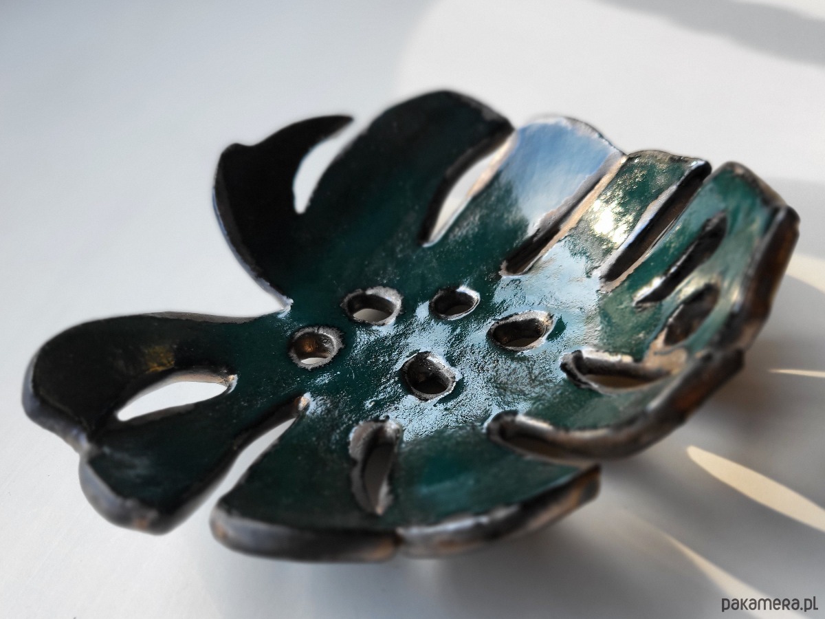 Ręcznie formowana ceramiczna mydelniczka w kształcie liścia monstrea.