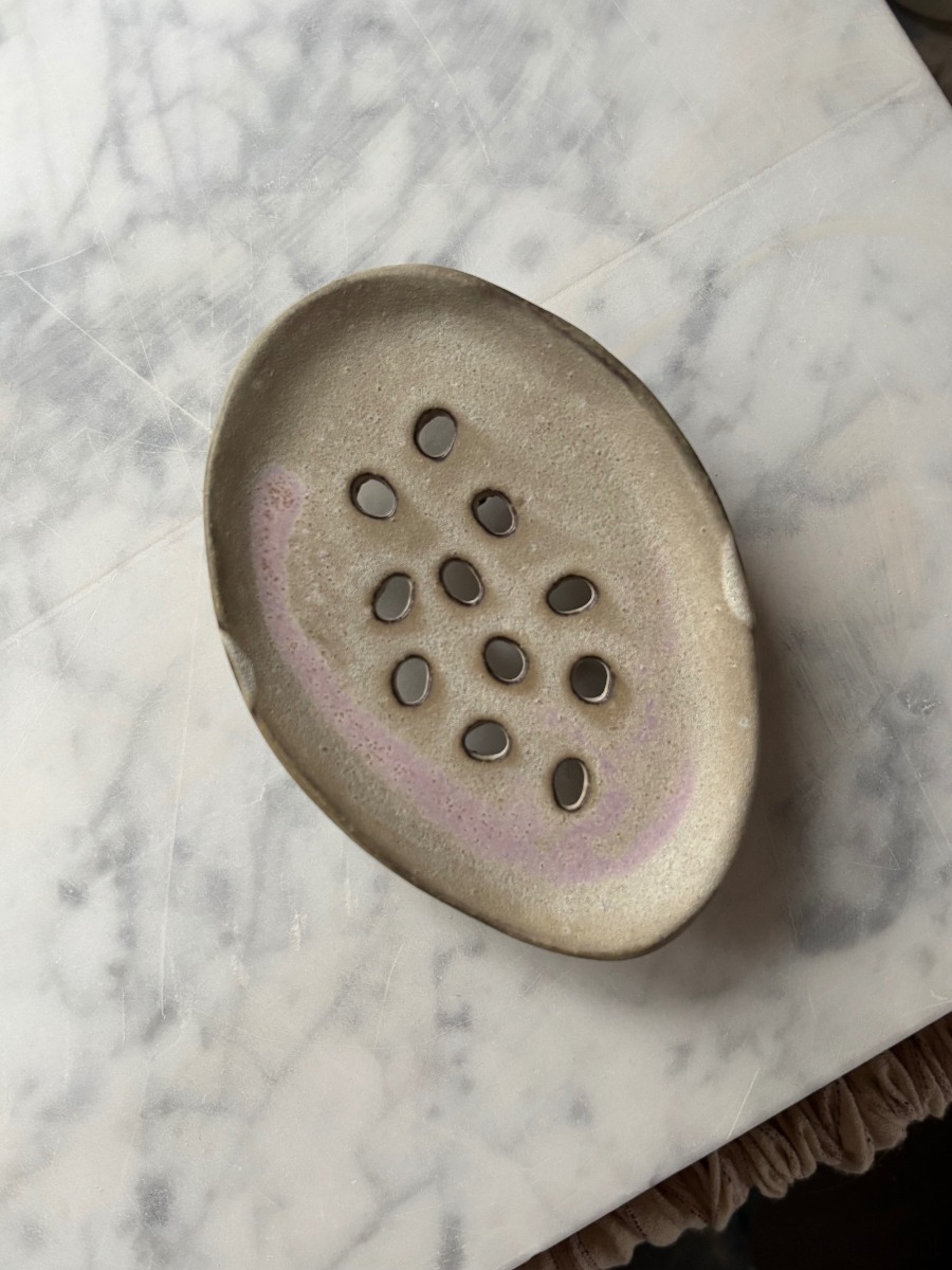 Ceramic soapdish in irregular shape.