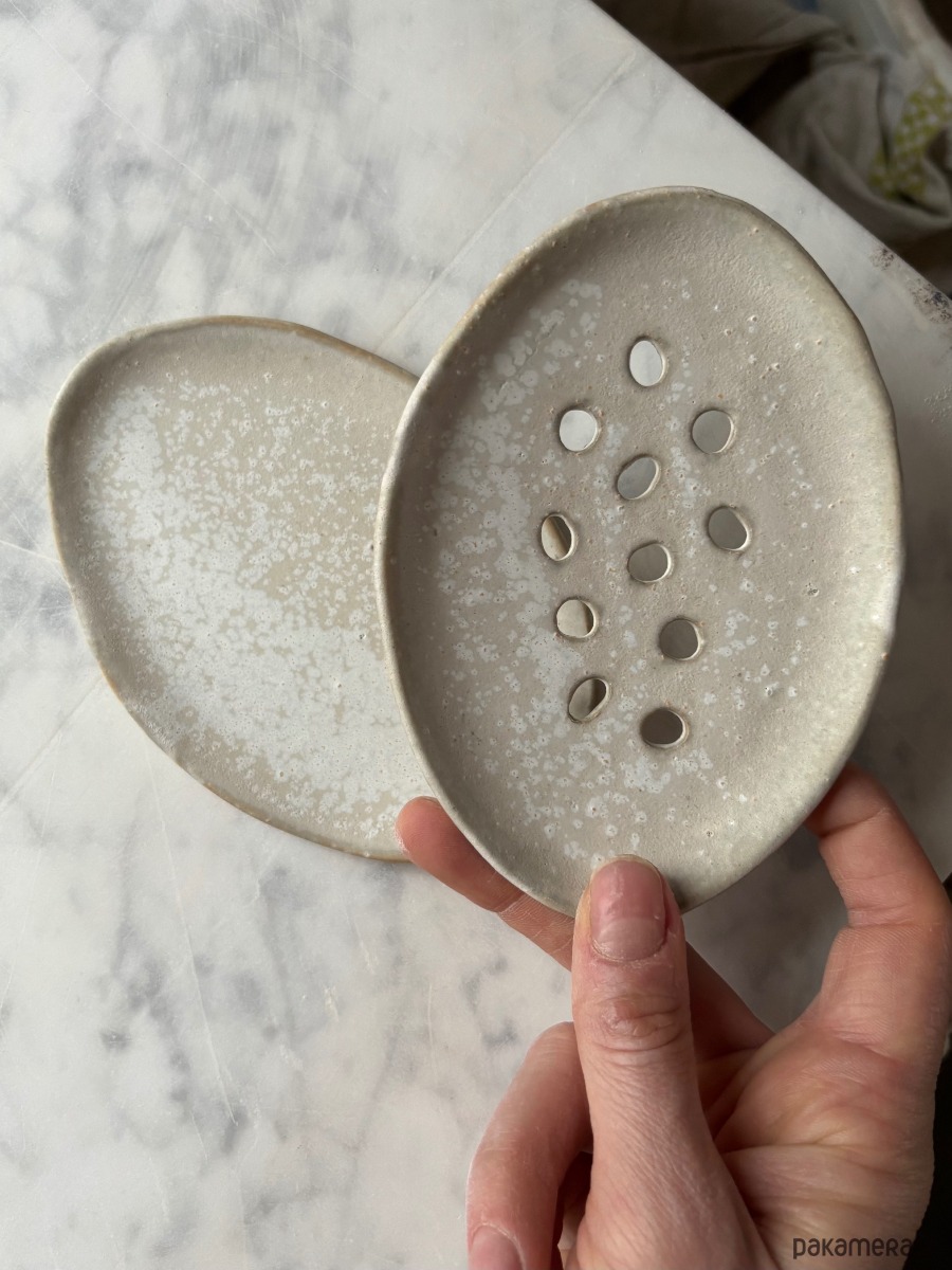 Ceramic soapdish in irregular shape.